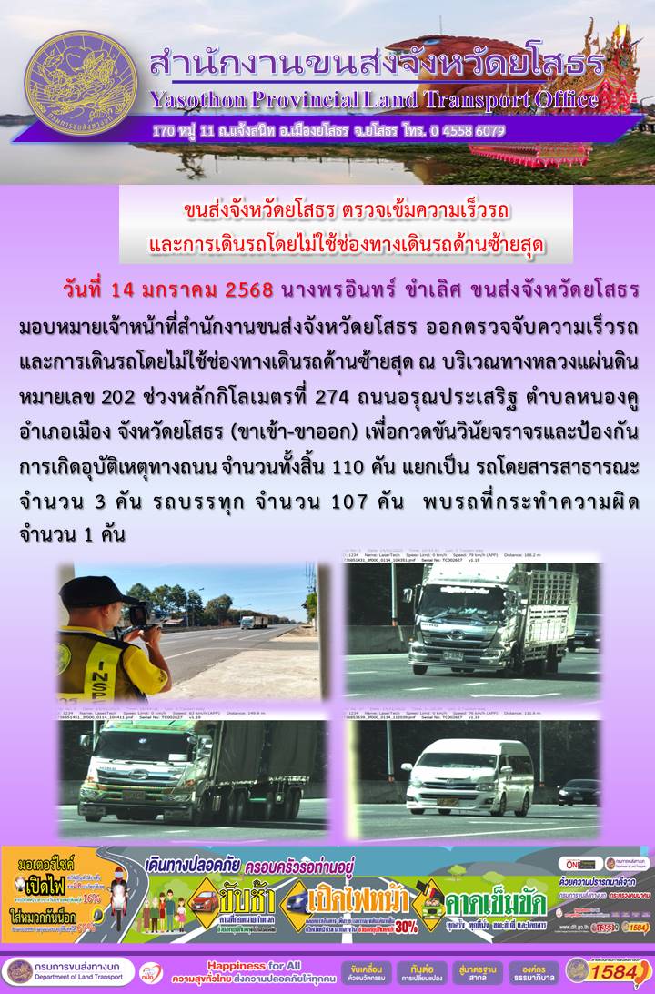 วันที่ 14 มกราคม 2568 เจ้าหน้าที่สำนักงานขนส่งจังหวัดยโสธร ออกตั้งจุดตรวจจับความเร็ว
