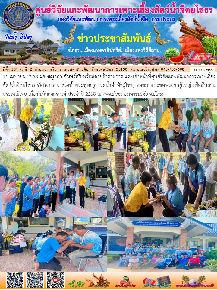 ผอ.ชญาภา จันทร์ศรี พร้อมด้วยข้าราชการ และเจ้าหน้าที่ศูนย์วิจัยและพัฒนาการเพาะเลี้ยงสัตว์น้ำจืดยโสธร จัดกิจกรรม สรงน้ำพระพุทธรูป รดน้ำดำหัวผู้ใหญ่ ขอขมาและขอพรจากผู้ใหญ่ เพื่อสืบสาน ประเพณีไทย เนื่องในวันสงกรานต์ ประจำปี 2568 ณ ศพจ.ยโสธร