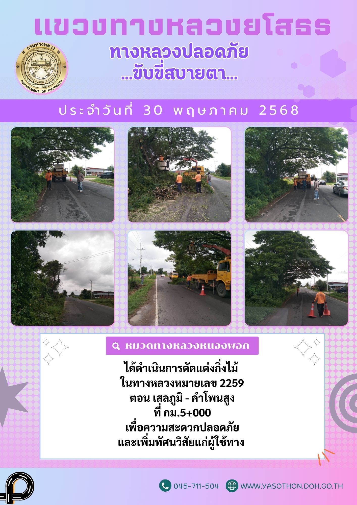 วันที่ 30 พฤษภาคม 2568 หมวดทางหลวงหนองพอก ได้ดำเนินการตัดแต่งกิ่งไม้ ในทางหลวงหมายเลข 2259 ตอน เสลภูมิ - คำโพนสูง ที่ กม.5+000 เพื่อความสะดวกปลอดภัย และเพิ่มทัศนวิสัยแก่ผู้ใช้ทาง