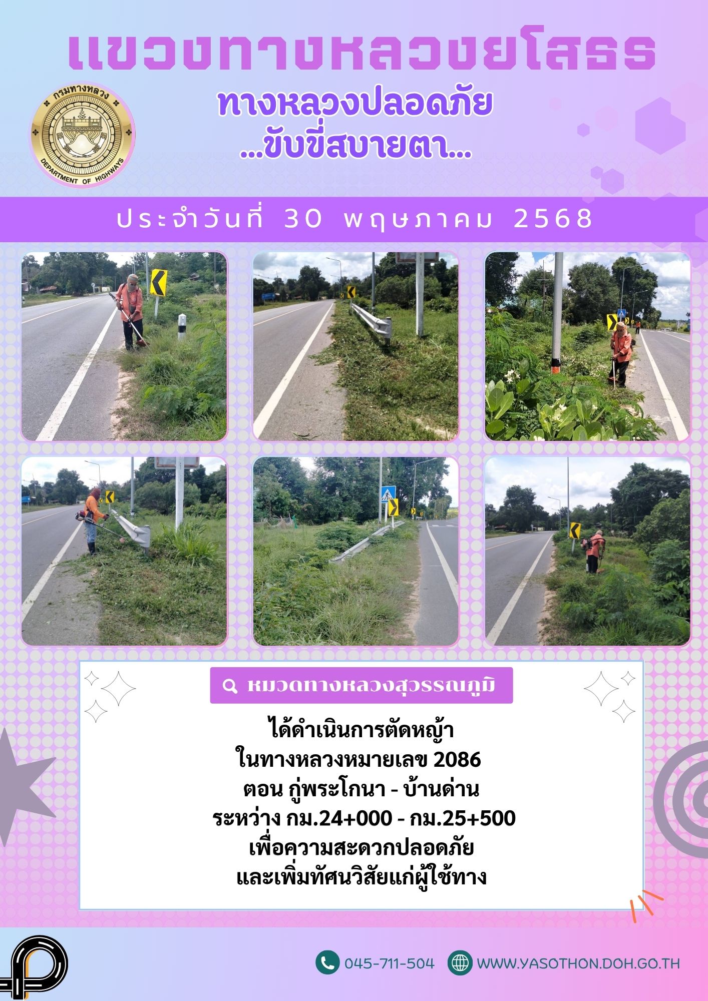 วันที่ 30 พฤษภาคม 2568 หมวดทางหลวงสุวรรณภูมิ ได้ดำเนินการตัดหญ้า ในทางหลวงหมายเลข 2086 ตอน กู่พระโกนา - บ้านด่าน ระหว่าง กม.24+000 - กม.25+500 เพื่อความสะดวกปลอดภัย และเพิ่มทัศนวิสัยแก่ผู้ใช้ทาง