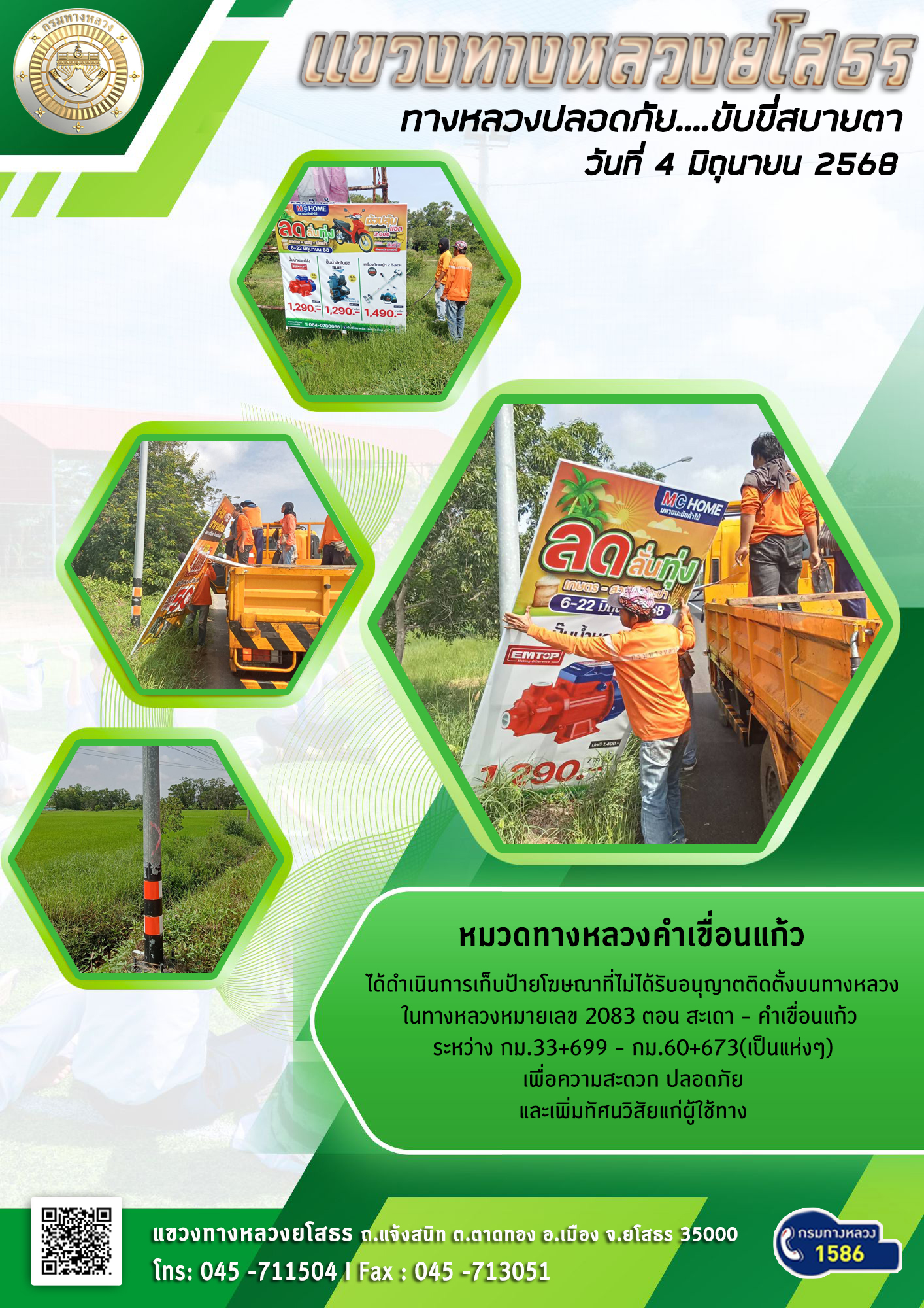 วันที่ 4 มิถุนายน 2568 หมวดทางหลวงคำเขื่อนแก้ว ได้ดำเนินการเก็บป้ายโฆษณาที่ไม่ได้รับอนุญาตติดตั้งบนทางหลวง ในทางหลวงหมายเลข 2083 ตอน สะเดา - คำเขื่อนแก้ว ระหว่าง กม.33+699 - กม.60+673 (เป็นแห่งๆ) เพื่อความสะดวก ปลอดภัย และเพิ่มทัศนวิสัยแก่ผู้ใช้ทาง