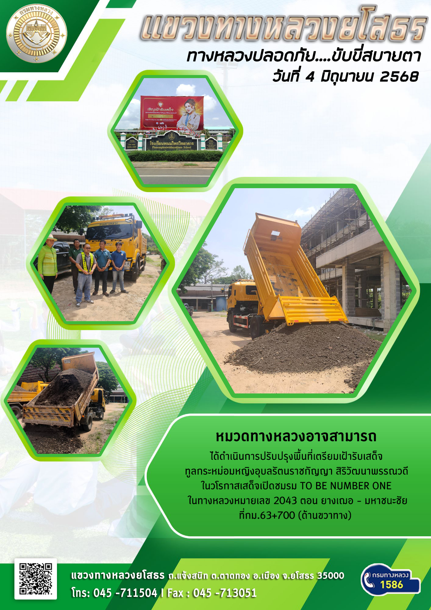 วันที่ 4 มิถุนายน 2568 หมวดทางหลวงอาจสามารถ ได้ดำเนินการปรับปรุงพื้นที่เตรียมเฝ้ารับเสด็จ ทูลกระหม่อมหญิงอุบลรัตนราชกัญญา สิริวัฒนาพรรณวดี ในวโรกาสเสด็จเปิดชมรม TO BE NUMBER ONE ในทางหลวงหมายเลข 2043 ตอน ยางเฌอ - มหาชนะชัย ที่ กม.63+700 (ด้านขวาทาง)