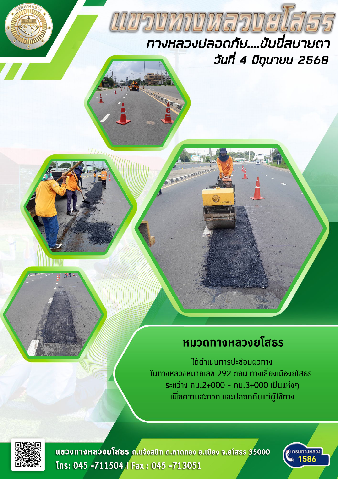 วันที่ 4 มิถุนายน 2568 หมวดทางหลวงยโสธร ได้ดำเนินการปะซ่อมผิวทาง ในทางหลวงหมายเลข 292 ตอน ทางเลี่ยงเมืองยโสธร ระหว่าง กม.2+000 - กม.3+000 เป็นแห่งๆ เพื่อความสะดวก และปลอดภัยแก่ผู้ใช้ทาง