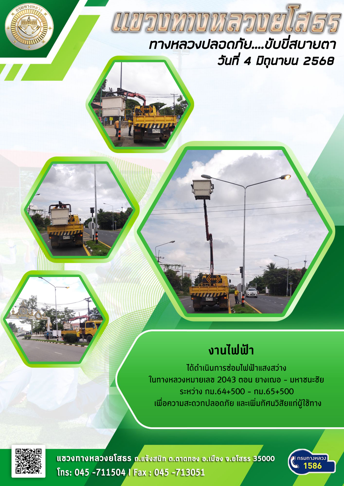 วันที่ 4 มิถุนายน 2568 งานไฟฟ้า ได้ดำเนินการซ่อมไฟฟ้าแสงสว่าง ในทางหลวงหมายเลข 2043 ตอน ยางเฌอ - มหาชนะชัย ระหว่าง กม.64+500 - กม.65+500 เพื่อความสะดวกปลอดภัย และเพิ่มทัศนวิสัยแก่ผู้ใช้ทาง
