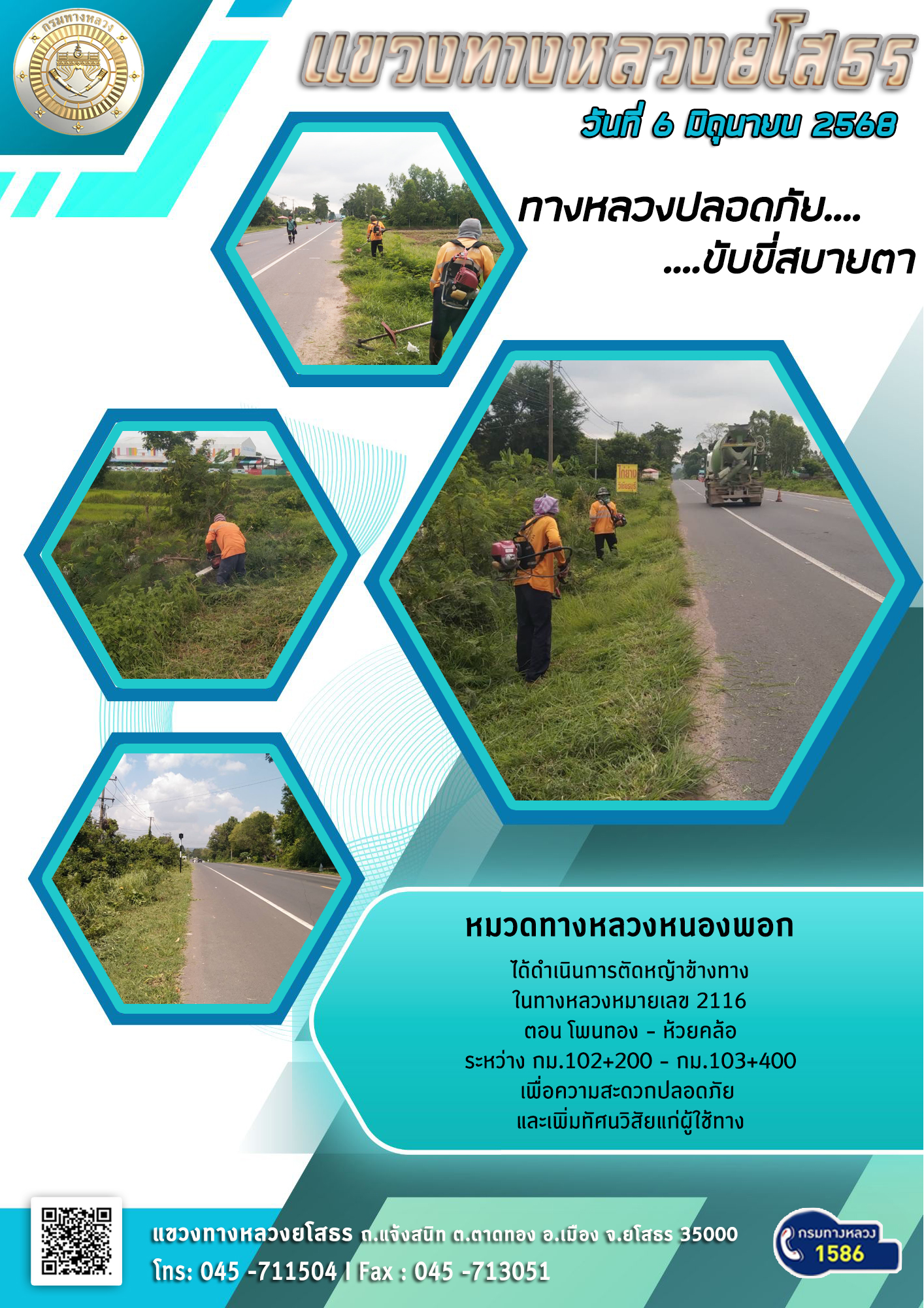 วันที่ 6 มิถุนายน 2568 หมวดทางหลวงหนองพอก ได้ดำเนินการตัดหญ้าข้างทาง ในทางหลวงหมายเลข 2116 ตอน โพนทอง - หัวยคล้อ ระหว่าง กม.102+200 - กม.103+400 เพื่อความสะดวกปลอดภัย และเพิ่มทัศนวิสัยแก่ผู้ใช้ทาง
