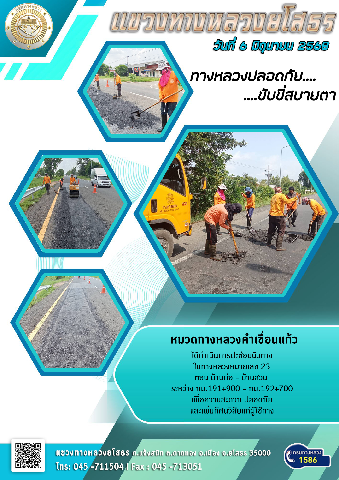 วันที่ 6 มิถุนายน 2568 หมวดทางหลวงคำเขื่อนแก้ว ได้ดำเนินการปะซ่อมผิวทาง ในทางหลวงหมายเลข 23 ตอน บ้านย่อ - บ้านสวน ระหว่าง กม.191+900 - กม.192+700 เพื่อความสะดวก ปลอดภัย และเพิ่มทัศนวิสัยแก่ผู้ใช้ทาง