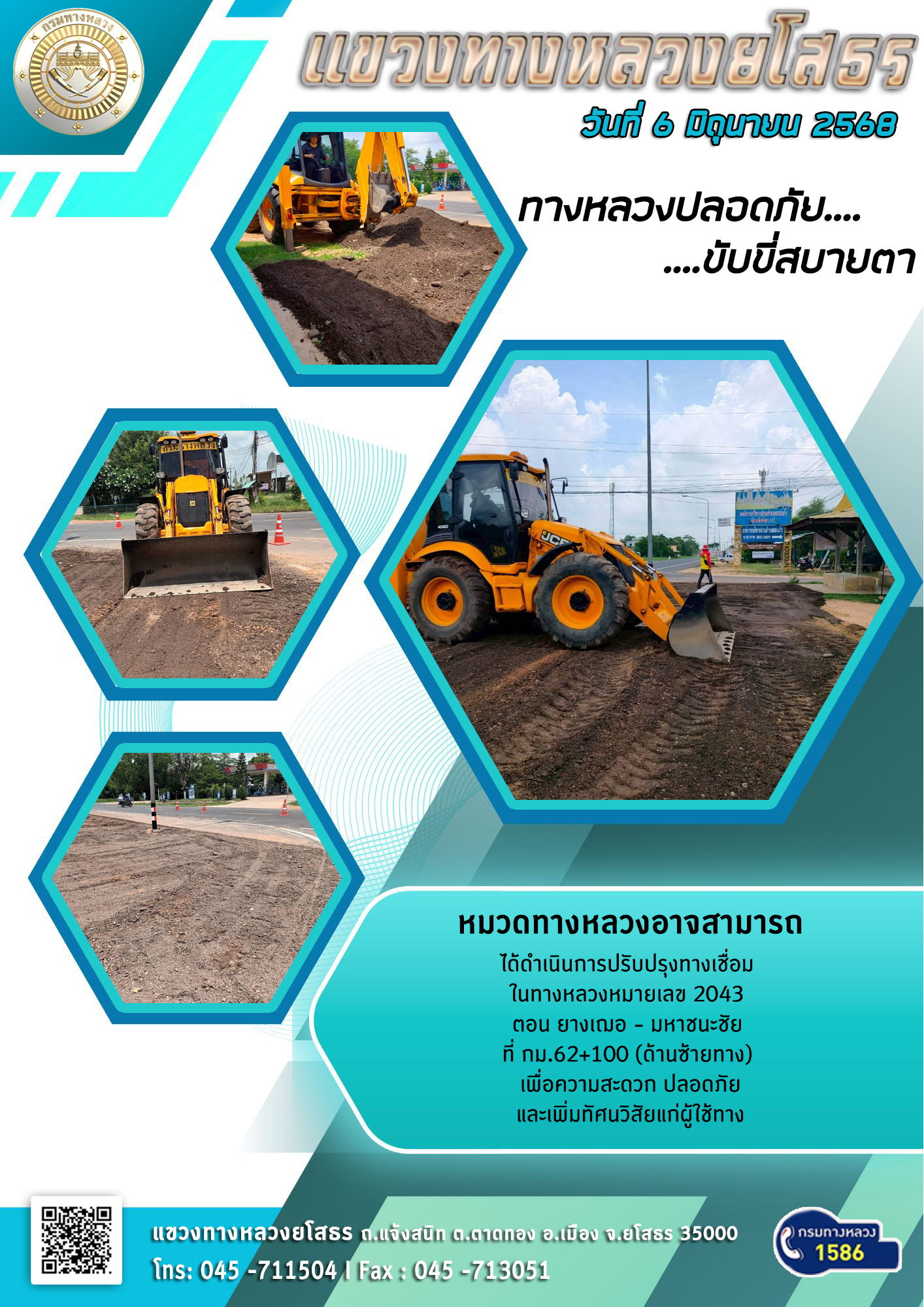 วันที่ 6 มิถุนายน 2568 หมวดทางหลวงอาจสามารถ ได้ดำเนินการปรับปรุงทางเชื่อม ในทางหลวงหมายเลข 2043 ตอน ยางเฌอ - มหาชนะชัย ที่ กม.62+100 (ด้านซ้ายทาง) เพื่อความสะดวก ปลอดภัย และเพิ่มทัศนวิสัยแก่ผู้ใช้ทาง