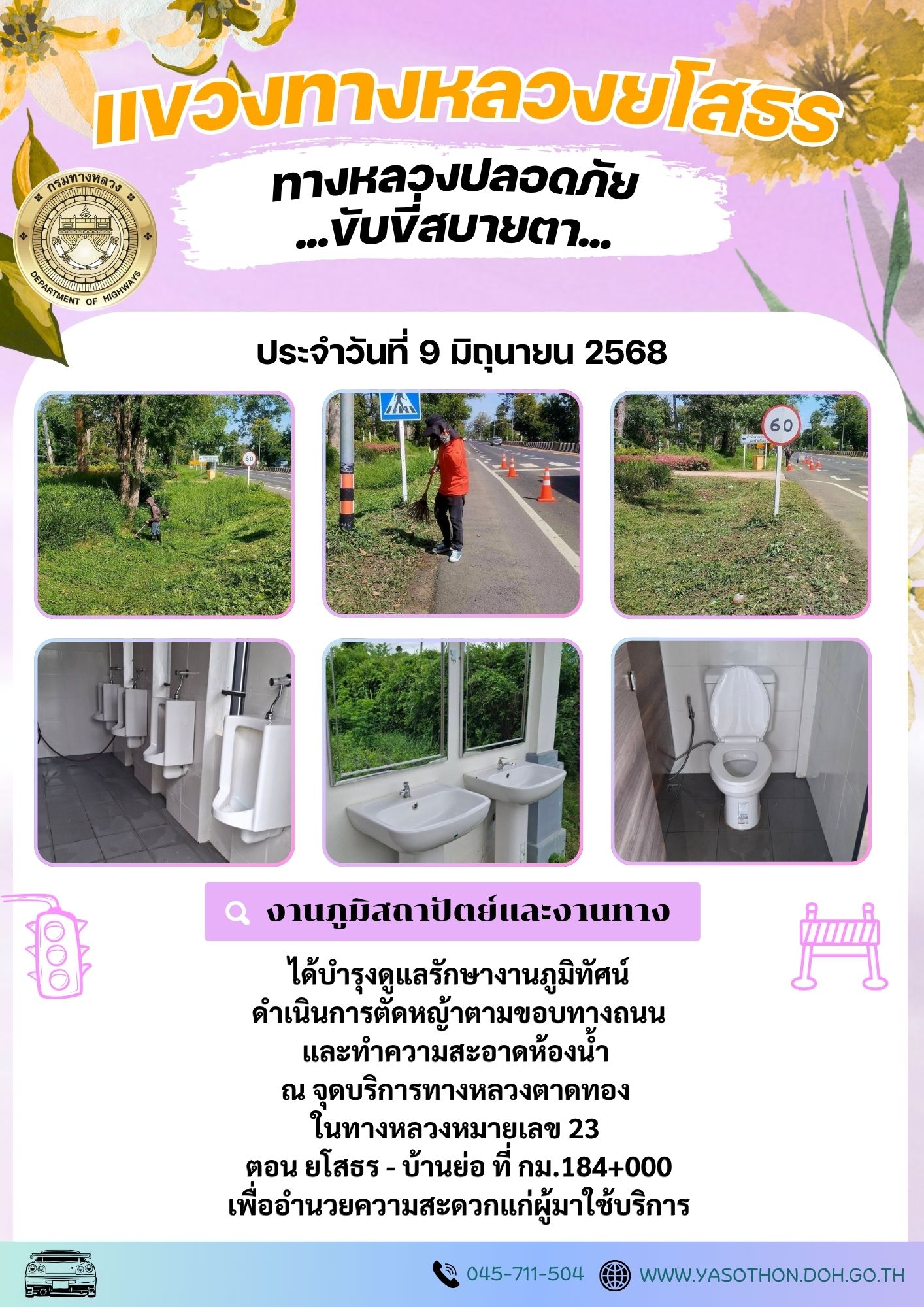 วันที่ 9 มิถุนายน 2568 งานภูมิสถาปัตย์และงานทาง ได้บำรุงดูแลรักษางานภูมิทัศน์ ดำเนินการตัดหญ้าตามขอบทางถนน และทำความสะอาดห้องน้ำ ณ จุดบริการทางหลวงตาดทอง ในทางหลวงหมายเลข 23 ตอน ยโสธร - บ้านย่อ ที่ กม.184+000 เพื่ออำนวยความสะดวกแก่ผู้มาใช้บริการ