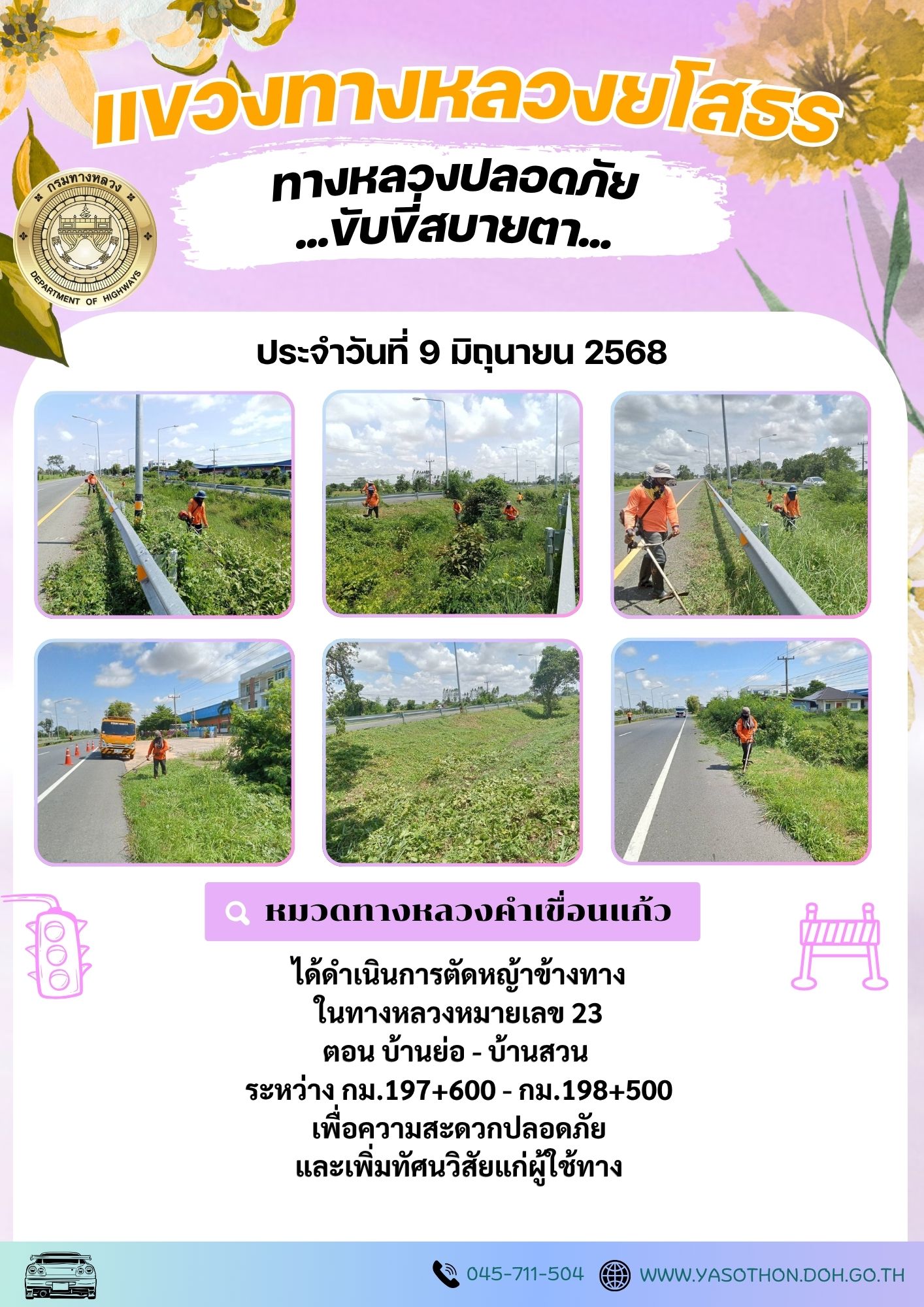 - [10:14] ทั่วไป วันอังคารที่ 31 มีนาคม 2569 หมวดทางหลวงคำเขื่อนแก้ว ได้ดำเนินการตัดหญ้าข้างทาง ในทางหลวงหมายเลข 23 ตอน บ้านย่อ - บ้านสวน ระหว่าง กม.204+000 - กม.205+000 เพื่อความสะดวก ปลอดภัย และเพิ่มทัศนวิสัยแก่ผู้ใช้ทาง