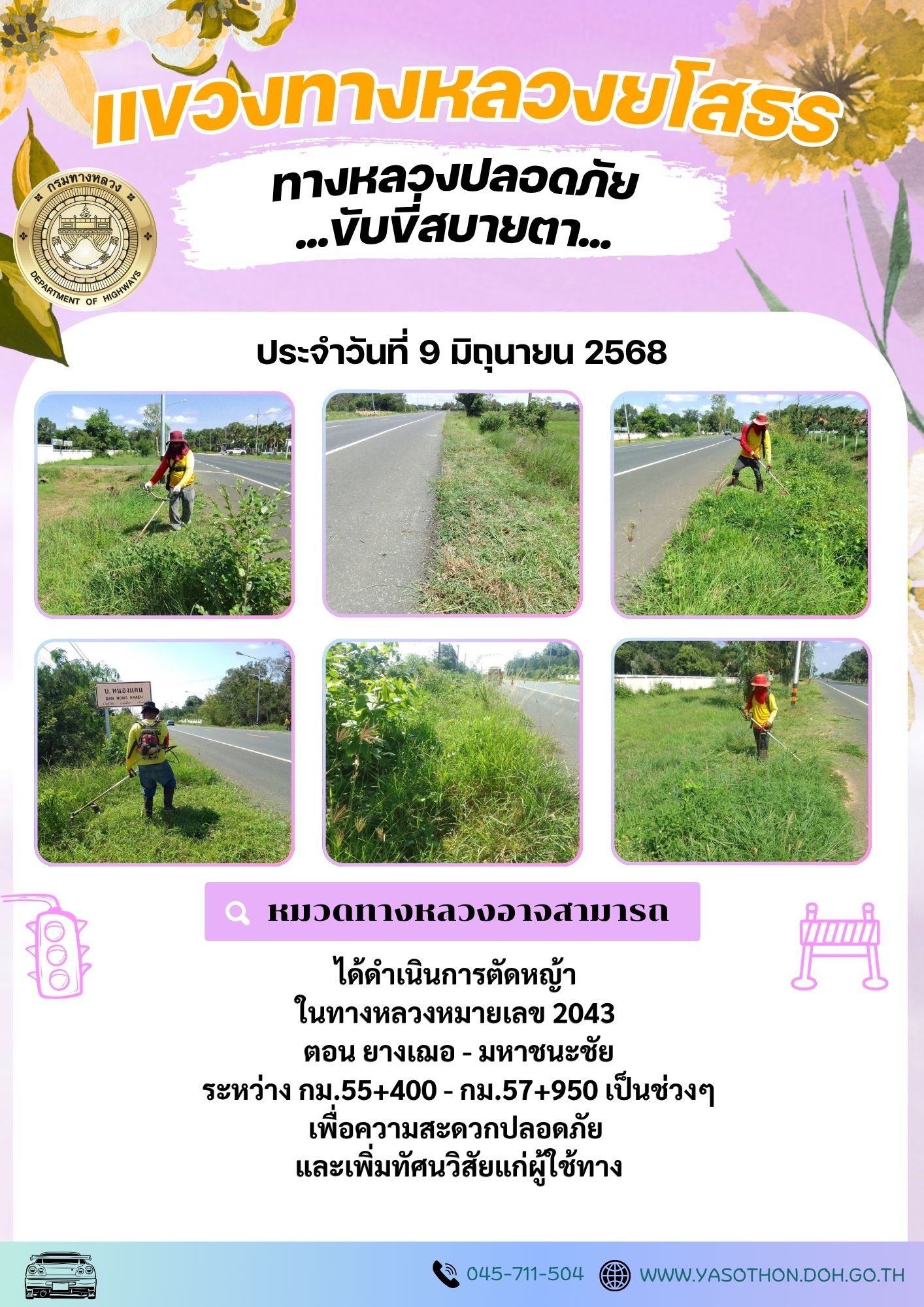 วันที่ 9 มิถุนายน 2568 หมวดทางหลวงอาจสามารถ ได้ดำเนินการตัดหญ้า ในทางหลวงหมายเลข 2043 ตอน ยางเฌอ - มหาชนะชัย ระหว่าง กม.55+400 - กม.57+950 เป็นช่วงๆ เพื่อความสะดวกปลอดภัย และเพิ่มทัศนวิสัยแก่ผู้ใช้ทาง