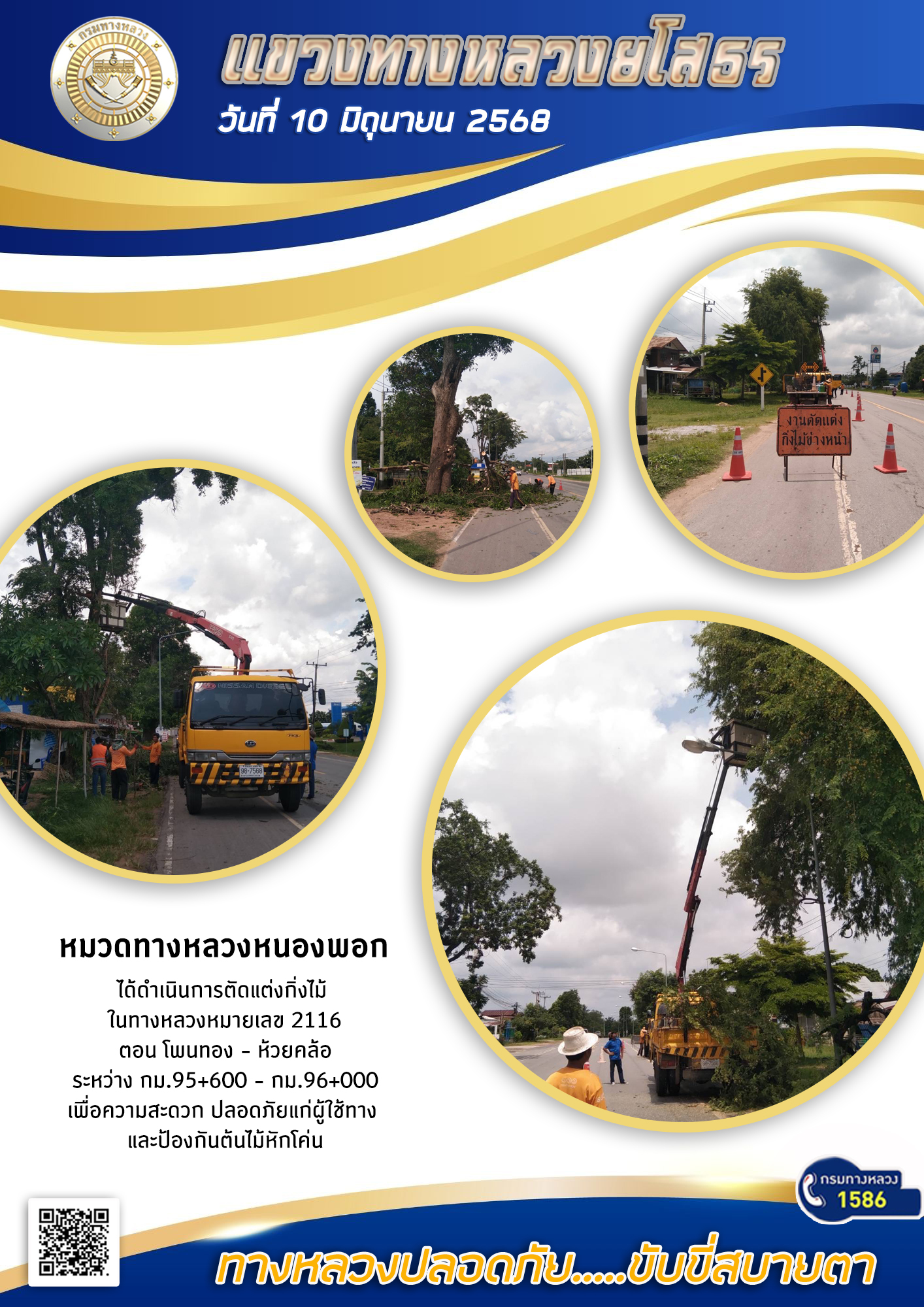 วันที่ 10 มิถุนายน 2568 หมวดทางหลวงหนองพอก ได้ดำเนินการตัดแต่งกิ่งไม้ ในทางหลวงหมายเลข 2116 ตอน โพนทอง - หัวยคล้อ ระหว่าง กม.95+600 - กม.96+000 เพื่อความสะดวก ปลอดภัยแก่ผู้ใช้ทาง และป้องกันต้นไม้หักโค่น