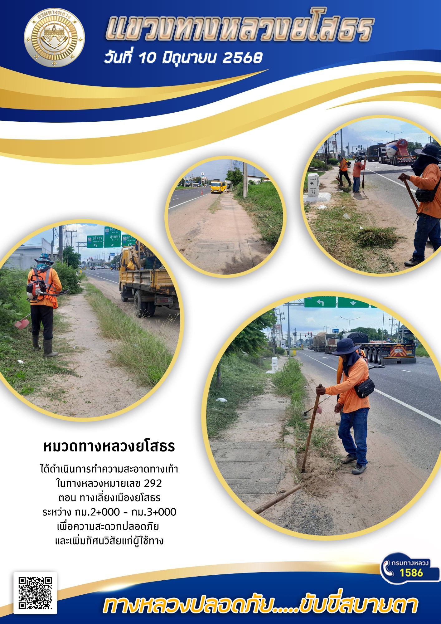 วันที่ 10 มิถุนายน 2568 หมวดทางหลวงยโสธร ได้ดำเนินการทำความสะอาดทางเท้า ในทางหลวงหมายเลข 292 ตอน ทางเลี่ยงเมืองยโสธร ระหว่าง กม.2+000 - กม.3+000 เพื่อความสะดวกปลอดภัย และเพิ่มทัศนวิสัยแก่ผู้ใช้ทาง