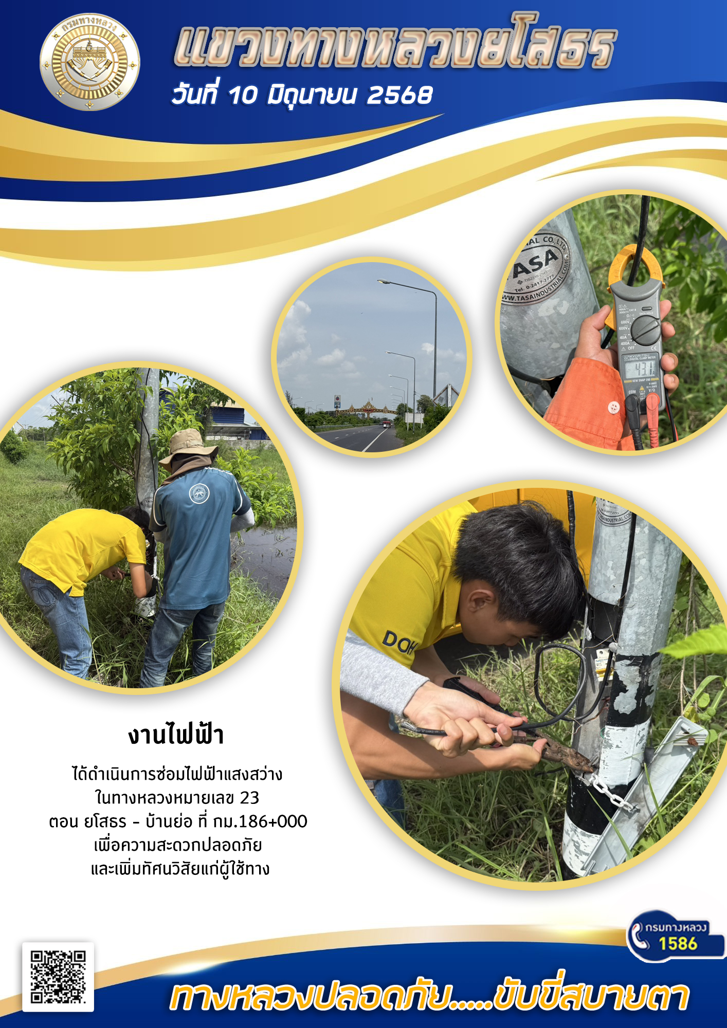 วันที่ 10 มิถุนายน 2568 งานไฟฟ้า ได้ดำเนินการซ่อมไฟฟ้าแสงสว่าง ในทางหลวงหมายเลข 23 ตอน ยโสธร - บ้านย่อ ที่ กม.186+000 เพื่อความสะดวกปลอดภัย และเพิ่มทัศนวิสัยแก่ผู้ใช้ทาง