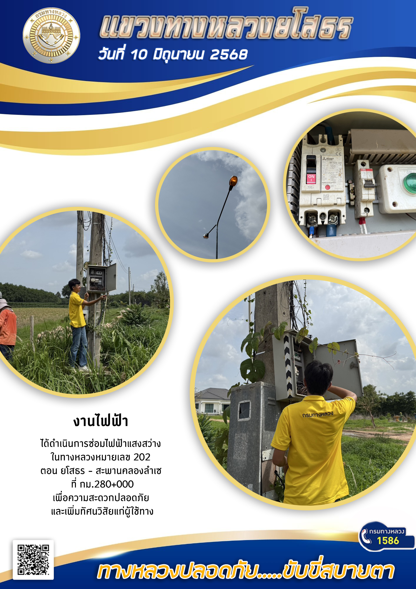วันที่ 10 มิถุนายน 2568 งานไฟฟ้า ได้ดำเนินการซ่อมไฟฟ้าแสงสว่าง ในทางหลวงหมายเลข 202 ตอน ยโสธร - สะพานคลองลำเซ ที่ กม.280+000 เพื่อความสะดวกปลอดภัย และเพิ่มทัศนวิสัยแก่ผู้ใช้ทาง