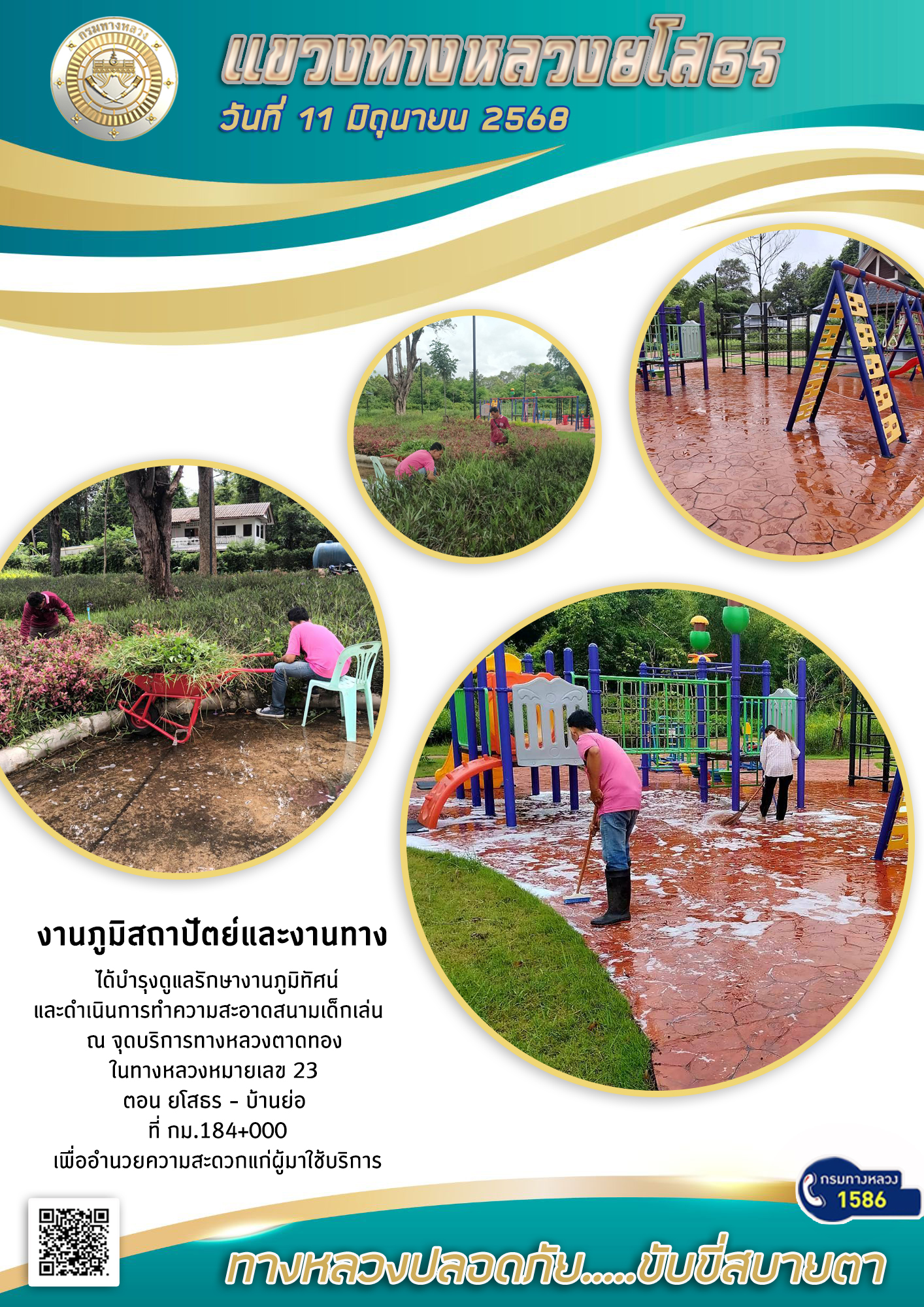 วันที่ 11 มิถุนายน 2568 งานภูมิสถาปัตย์และงานทาง ได้บำรุงดูแลรักษางานภูมิทัศน์ และดำเนินการทำความสะอาดสนามเด็กเล่น ณ จุดบริการทางหลวงตาดทอง ในทางหลวงหมายเลข 23 ตอน ยโสธร - บ้านย่อ ที่ กม.184+000 เพื่ออำนวยความสะดวกแก่ผู้มาใช้บริการ