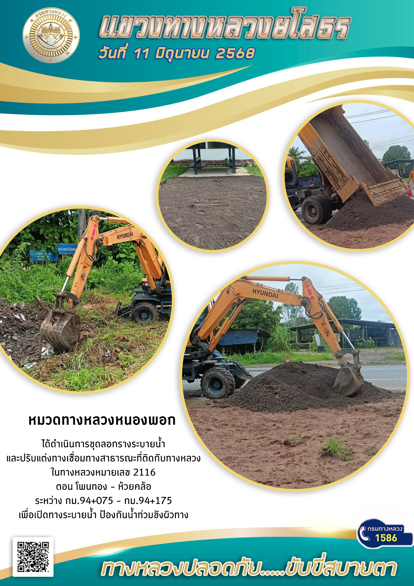 วันที่ 11 มิถุนายน 2568 หมวดทางหลวงหนองพอก ได้ดำเนินการขุดลอกรางระบายน้ำ และปรับแต่งทางเชื่อมทางสาธารณะที่ติดกับทางหลวง ในทางหลวงหมายเลข 2116 ตอน โพนทอง - หัวยคล้อ ระหว่าง กม.94+075 - กม.94+175 เพื่อเปิดทางระบายน้ำ ป้องกันน้ำท่วมขังผิวทาง