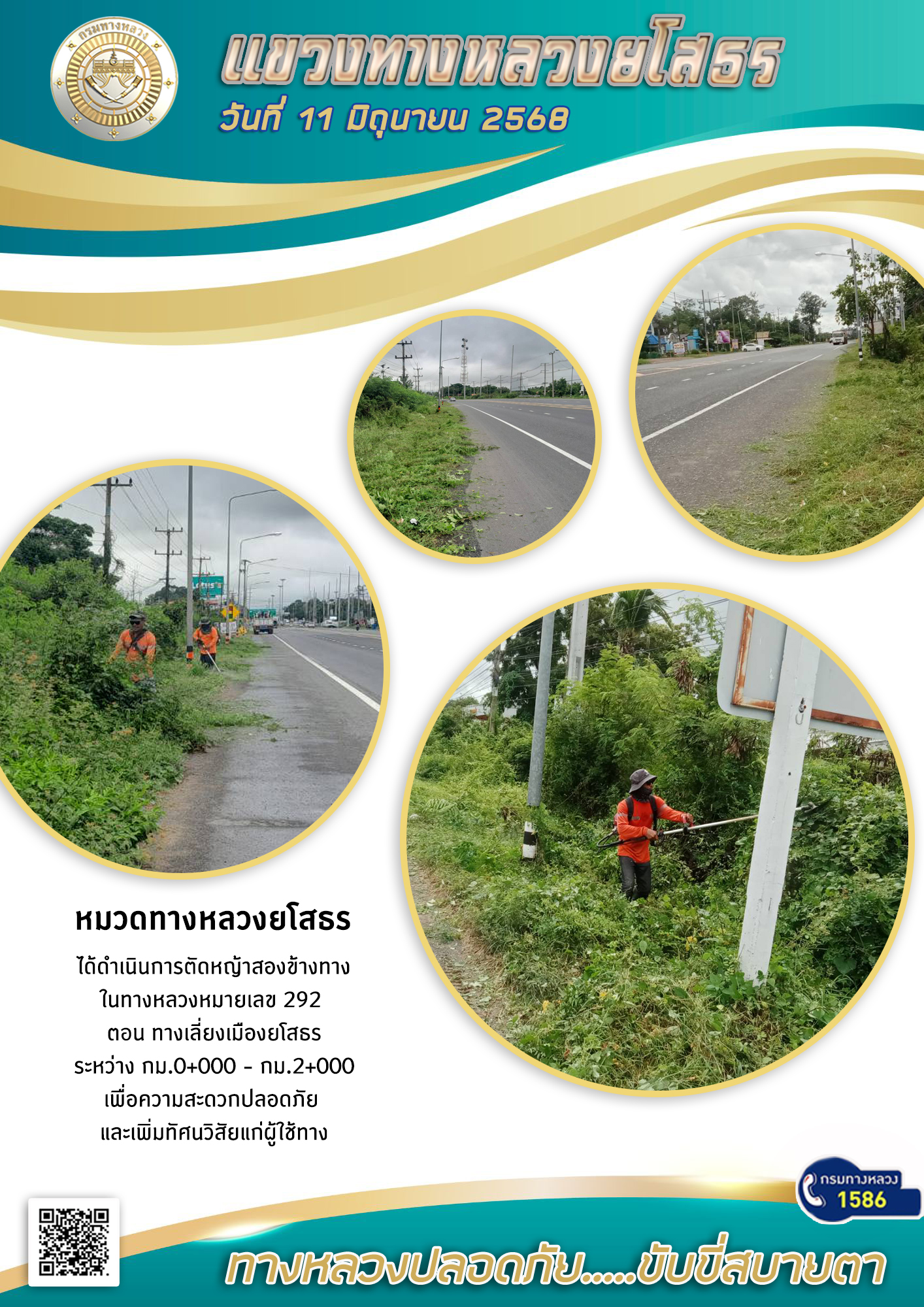 วันที่ 11 มิถุนายน 2568 หมวดทางหลวงยโสธร ได้ดำเนินการตัดหญ้าสองข้างทาง ในทางหลวงหมายเลข 292 ตอน ทางเลี่ยงเมืองยโสธร ระหว่าง กม.0+000 - กม.2+000 เพื่อความสะดวกปลอดภัย และเพิ่มทัศนวิสัยแก่ผู้ใช้ทาง