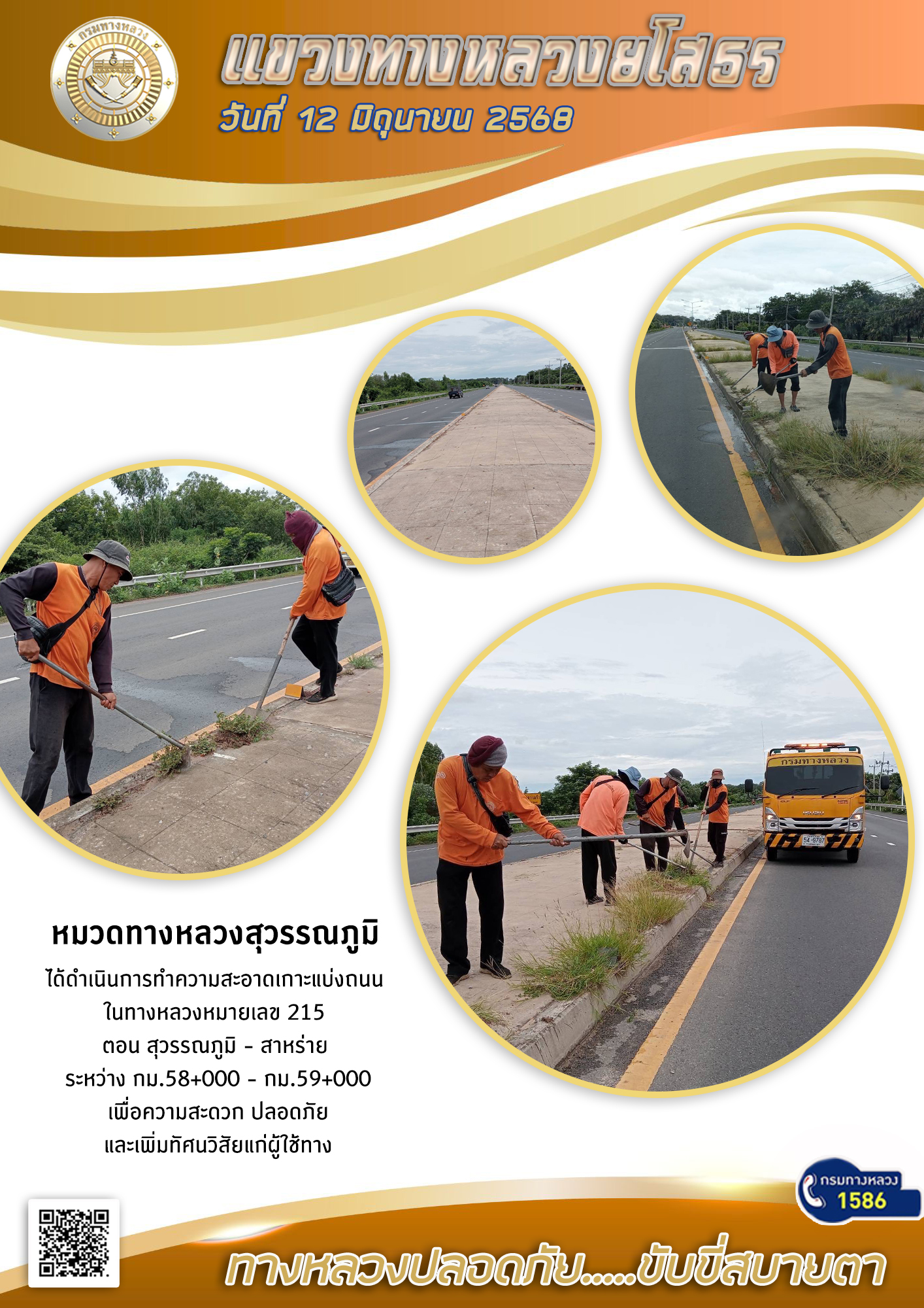วันที่ 12 มิถุนายน 2568 หมวดทางหลวงสุวรรณภูมิ ได้ดำเนินการทำความสะอาดเกาะแบ่งถนน ในทางหลวงหมายเลข 215 ตอน สุวรรณภูมิ - สาหร่าย ระหว่าง กม.58+000 - กม.59+000 เพื่อความสะดวก ปลอดภัย และเพิ่มทัศนวิสัยแก่ผู้ใช้ทาง
