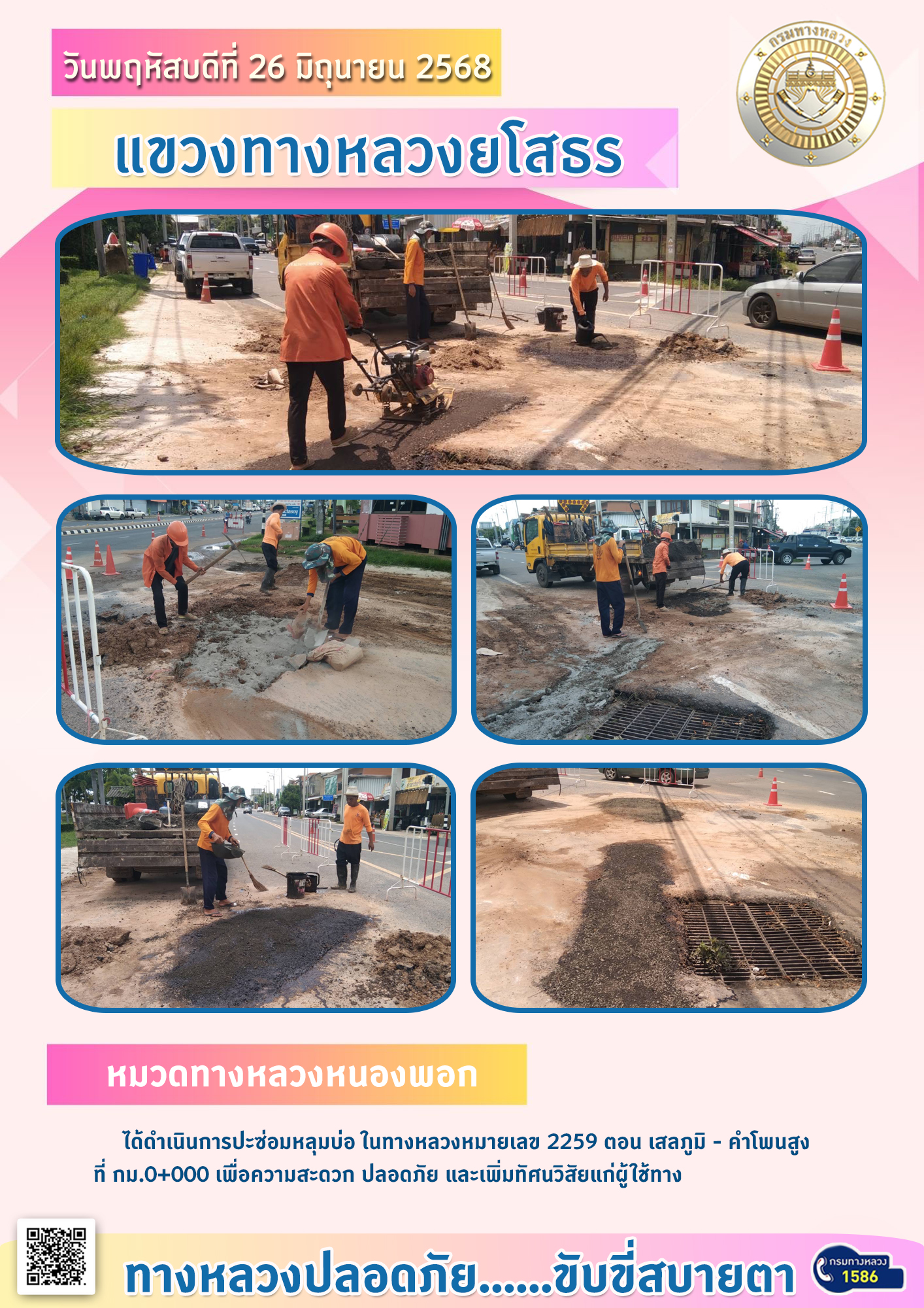 วันพฤหัสบดีที่ 26 มิถุนายน 2568 หมวดทางหลวงหนองพอก ได้ดำเนินการปะซ่อมหลุมบ่อ ในทางหลวงหมายเลซ 2259 ตอน เสลภูมิ - คำโพนสูง ที่ กม.0+000 เพื่อความสะดวก ปลอดภัย และเพิ่มทัศนวิสัยแก่ผู้ใช้ทาง