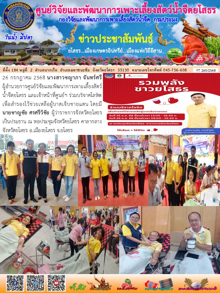 นางสาวชญาภา จันทร์ศรี ผู้อำนวยการศูนย์วิจัยและพัฒนาการเพาะเลี้ยงสัตว์น้ำจืดยโสธร และเจ้าหน้าที่ศูนย์ฯ ร่วมบริจาคโลหิต เพื่อสำรองไว้ช่วยเหลือผู้บาดเจ็บชายแดน