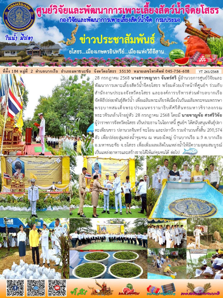ผอ.ศพจ.ยโสธร พร้อมด้วยเจ้าหน้าที่ศูนย์ฯ ร่วมกับสนง.ปจ.ยโสธร และอบต.บากเรือ จัดพิธีปล่อยพันธุ์สัตว์น้ำ เพื่อเฉลิมพระเกียรติเนื่องในวันเฉลิมพระชนมพรรษา พระบาทสมเด็จพระปรเมนทรรามาธิบดีศรีสินทรมหาวชิราลงกรณ พระวชิรเกล้าเจ้าอยู่หัว 28 กรกฎาคม 2568