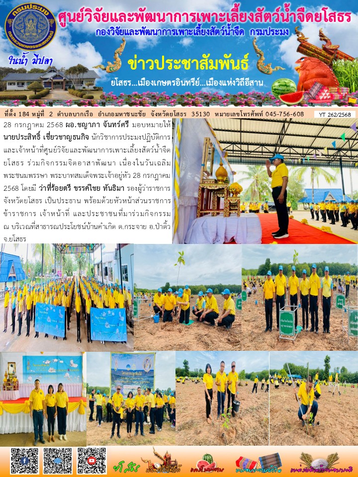 นายประสิทธิ์ เชี่ยวชาญธนกิจ นักวิชาการประมงปฏิบัติการ และเจ้าหน้าที่ศูนย์วิจัยและพัฒนาการเพาะเลี้ยงสัตว์น้ำจืดยโสธร ร่วมกิจกรรมจิตอาสาพัฒนา เนื่องในวันเฉลิมพระชนมพรรษา พระบาทสมเด็จพระเจ้าอยู่หัว 28 กรกฎาคม 2568