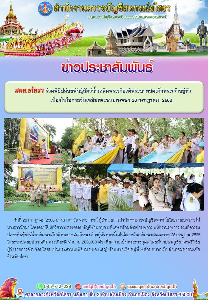 สตส.ยโสธร ร่วมพิธีปล่อยพันธุ์สัตว์น้ำเฉลิมพระเกียรติพระบาทสมเด็จพระเจ้าอยู่หัว เนื่องในโอกาสวันเฉลิมพระชนมพรรษา 28 กรกฎาคม 2568