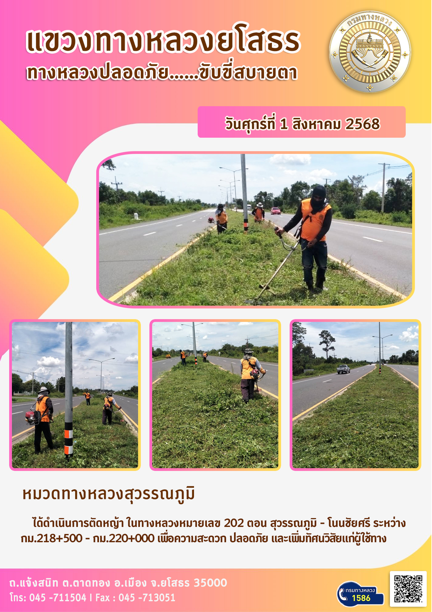 วันศุกร์ที่ 1 สิงหาคม 2568 หมวดทางหลวงสุวรรณภูมิ ได้ดำเนินการตัดหญ้า ในทางหลวงหมายเลข 202 ตอน สุวรรณภูมิ - โนนชัยศรี ระหว่าง กม.218+500 - กม.220+000 เพื่อความสะดวก ปลอดภัย และเพิ่มทัศนวิสัยแก่ผู้ใช้ทาง