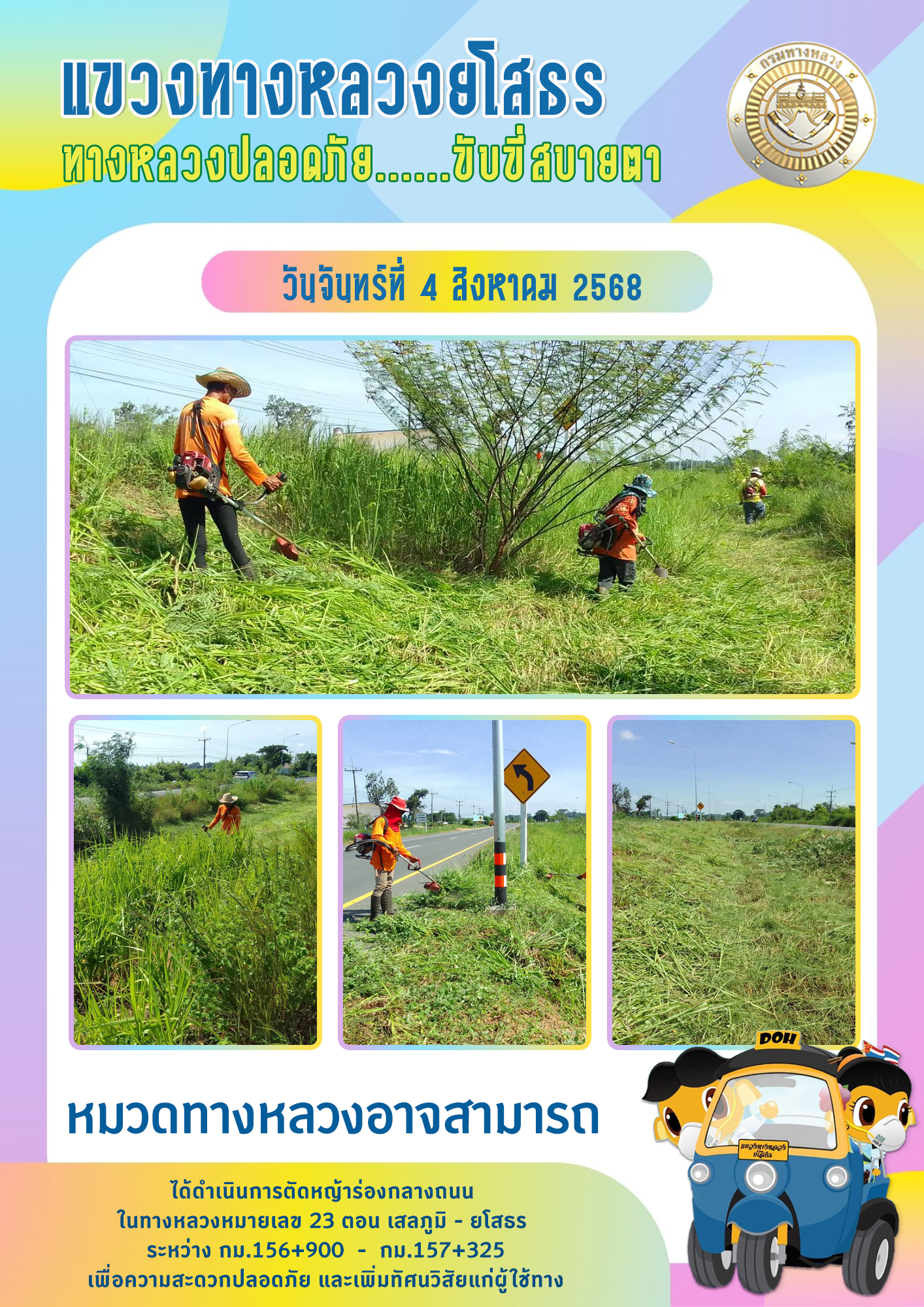- [10:21] ทั่วไป วันอังคารที่ 31 มีนาคม 2569 งานอำนวยความปลอดภัย ได้ดำเนินการตัดหญ้า ทำความสะอาดภายในบริเวณแขวงทางหลวงยโสธร