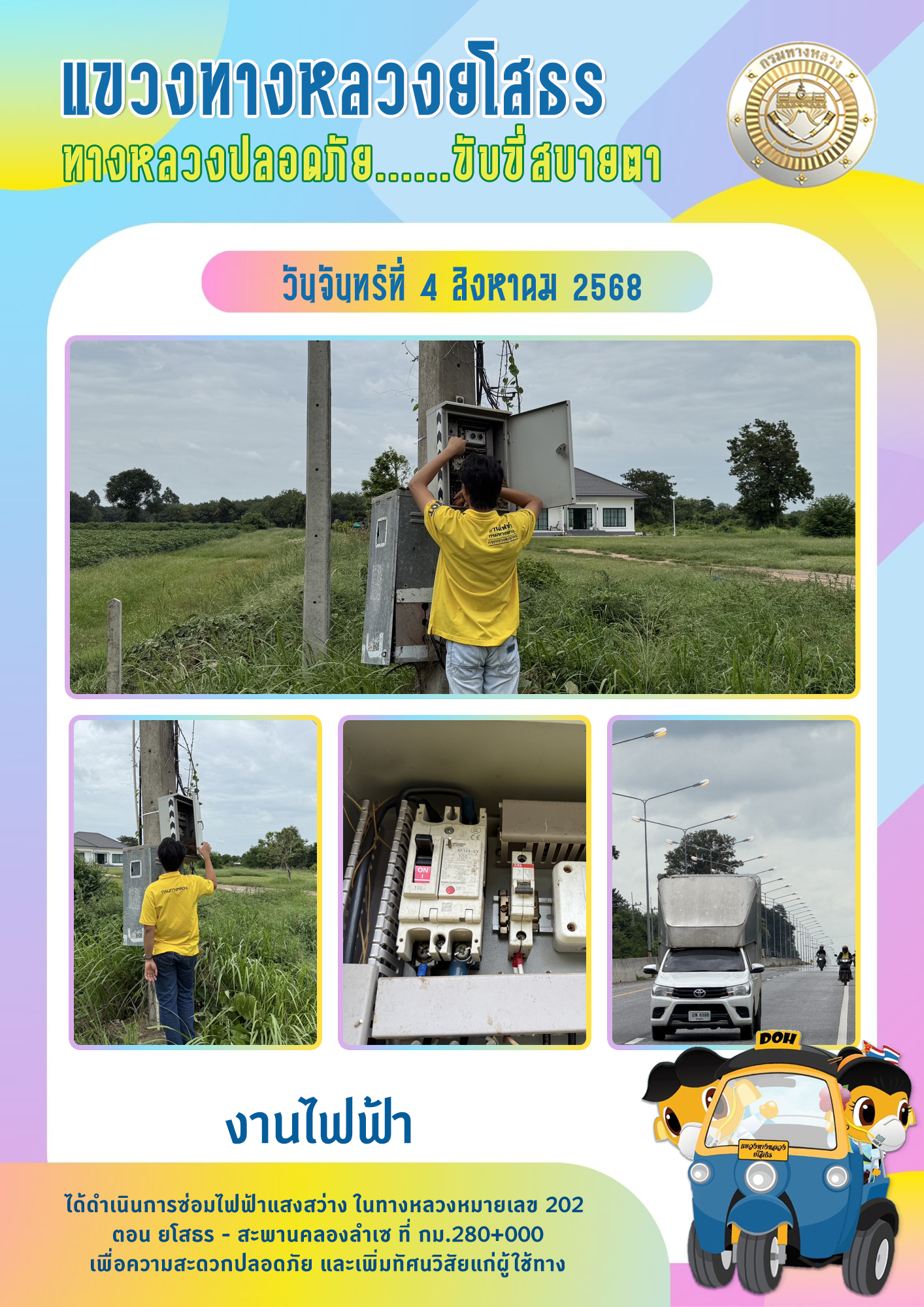 วันจันทร์ที่ 4 สิงหาคม 2568 งานไฟฟ้า ได้ดำเนินการซ่อมไฟฟ้าแสงสว่าง ในทางหลวงหมายเลข 202 ตอน ยโสธร - สะพานคลองลำเซ ที่ กม.280+000 เพื่อความสะดวกปลอดภัย และเพิ่มทัศนวิสัยแก่ผู้ใช้ทาง