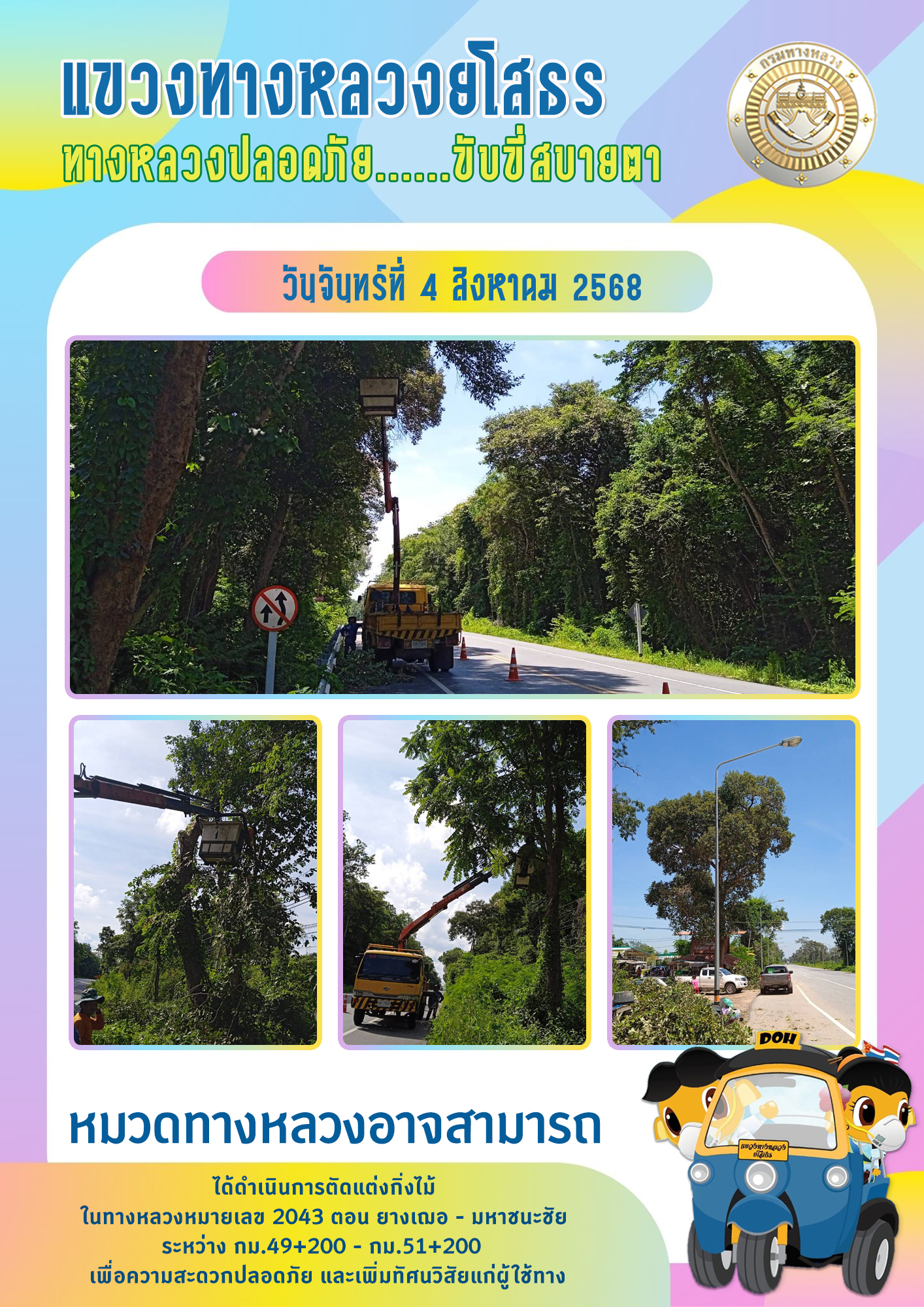 วันจันทร์ที่ 4 สิงหาคม 2568 หมวดทางหลวงอาจสามารถ ได้ดำเนินการตัดแต่งกิ่งไม้ ในทางหลวงหมายเลข 2043 ตอน ยางเฌอ - มหาชนะชัย ระหว่าง กม.49+200 - กม.51+200 เพื่อความสะดวกปลอดภัย และเพิ่มทัศนวิสัยแก่ผู้ใช้ทาง