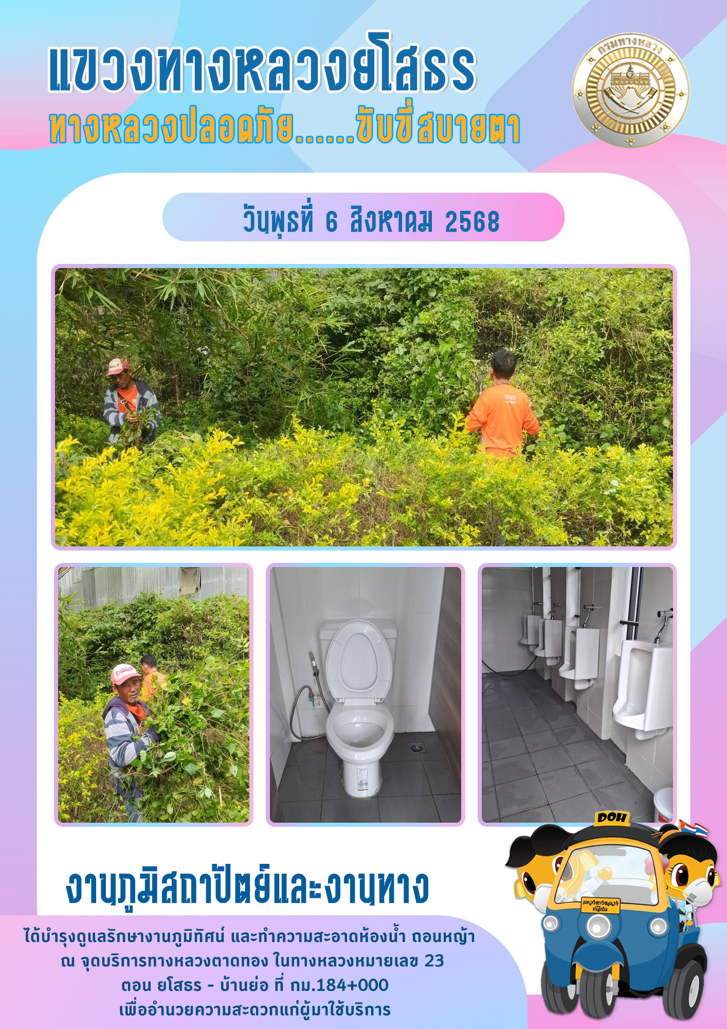 วันพุธที่ 6 สิงหาคม 2568 งานภูมิสถาปัตย์และงานทาง ได้บำรุงดูแลรักษางานภูมิทัศน์ และทำความสะอาดห้องน้ำ ถอนหญ้า ณ จุดบริการทางหลวงตาดทอง ในทางหลวงหมายเลข 23 ตอน ยโสธร - บ้านย่อ ที่ กม.184+000 เพื่ออำนวยความสะดวกแก่ผู้มาใช้บริการ