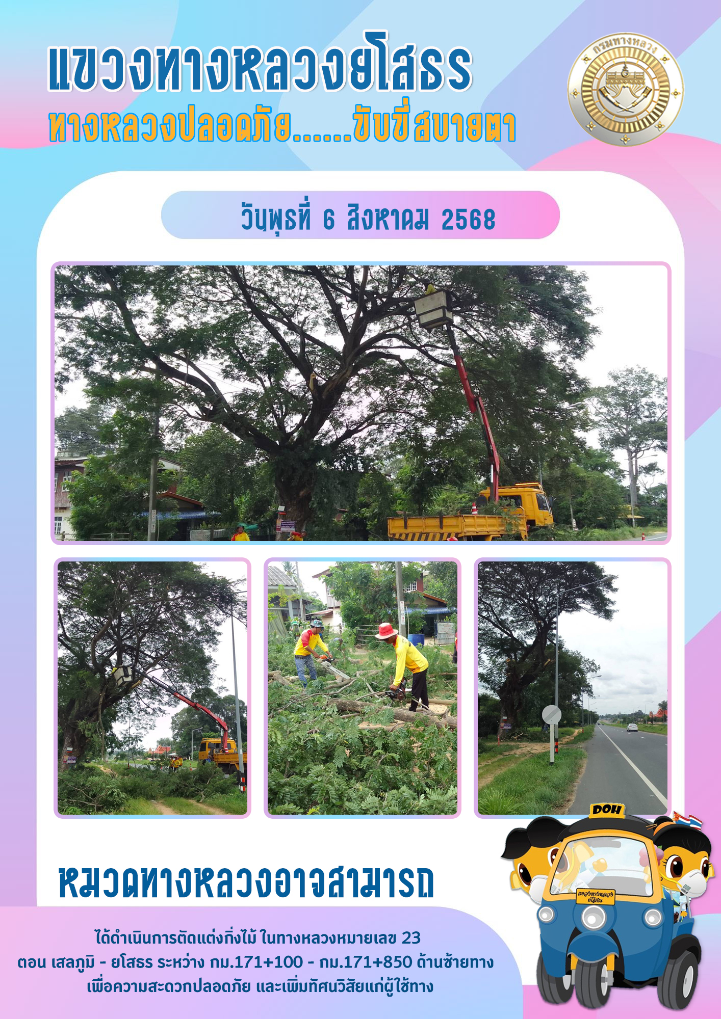 วันพุธที่ 6 สิงหาคม 2568 หมวดทางหลวงอาจสามารถ ได้ดำเนินการตัดแต่งกิ่งไม้ ในทางหลวงหมายเลข 23 ตอน เสลภูมิ - ยโสธร ระหว่าง กม.171+100 - กม.171+850 ด้านซ้ายทาง เพื่อความสะดวกปลอดภัย และเพิ่มทัศนวิสัยแก่ผู้ใช้ทาง
