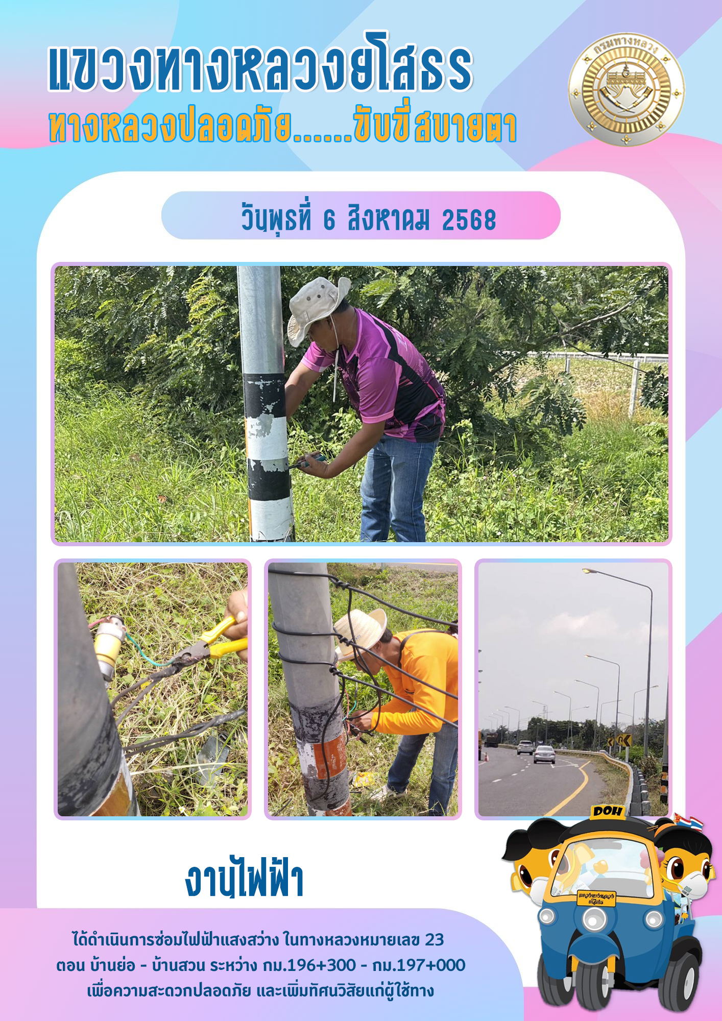 วันพุธที่ 6 สิงหาคม 2568 งานไฟฟ้า ได้ดำเนินการซ่อมไฟฟ้าแสงสว่าง ในทางหลวงหมายเลข 23 ตอน บ้านย่อ - บ้านสวน ระหว่าง กม.196+300 - กม.197+000 เพื่อความสะดวกปลอดภัย และเพิ่มทัศนวิสัยแก่ผู้ใช้ทาง