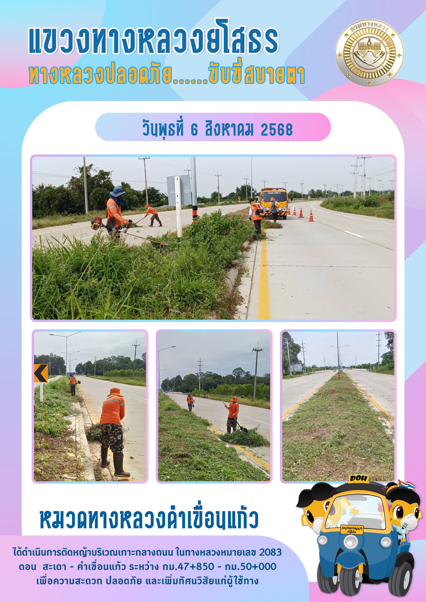 วันพุธที่ 6 สิงหาคม 2568 หมวดทางหลวงคำเขื่อนแก้ว ได้ดำเนินการตัดหญ้าบริเวณเกาะกลางถนน ในทางหลวงหมายเลข 2083 ตอน สะเดา - คำเขื่อนแก้ว ระหว่าง กม.47+850 - กม.50+000 เพื่อความสะดวก ปลอดภัย และเพิ่มทัศนวิสัยแก่ผู้ใช้ทาง