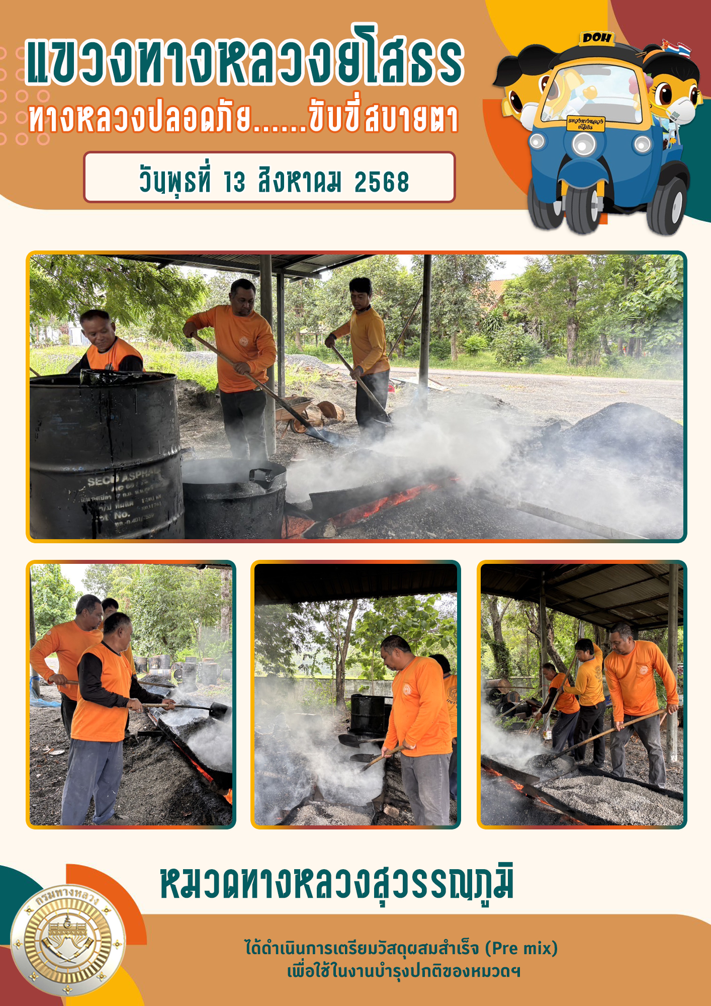 วันพุธที่ 13 สิงหาคม 2568 หมวดทางหลวงสุวรรณภูมิ ได้ดำเนินการเตรียมวัสดุผสมสำเร็จ (Pre mix) เพื่อใช้ในงานบำรุงปกติของหมวดฯ