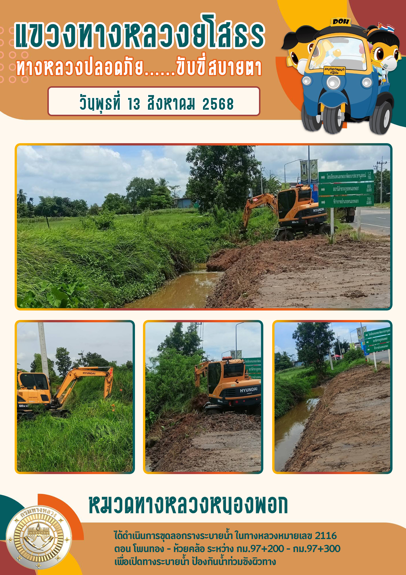 วันพุธที่ 13 สิงหาคม 2568 หมวดทางหลวงหนองพอก ได้ดำเนินการขุดลอกรางระบายน้ำ ในทางหลวงหมายเลข 2116 ตอน โพนทอง - ห้วยคล้อ ระหว่าง กม.97+200 - กม.97+300 เพื่อเปิดทางระบายน้ำ ป้องกันน้ำท่วมขังผิวทาง