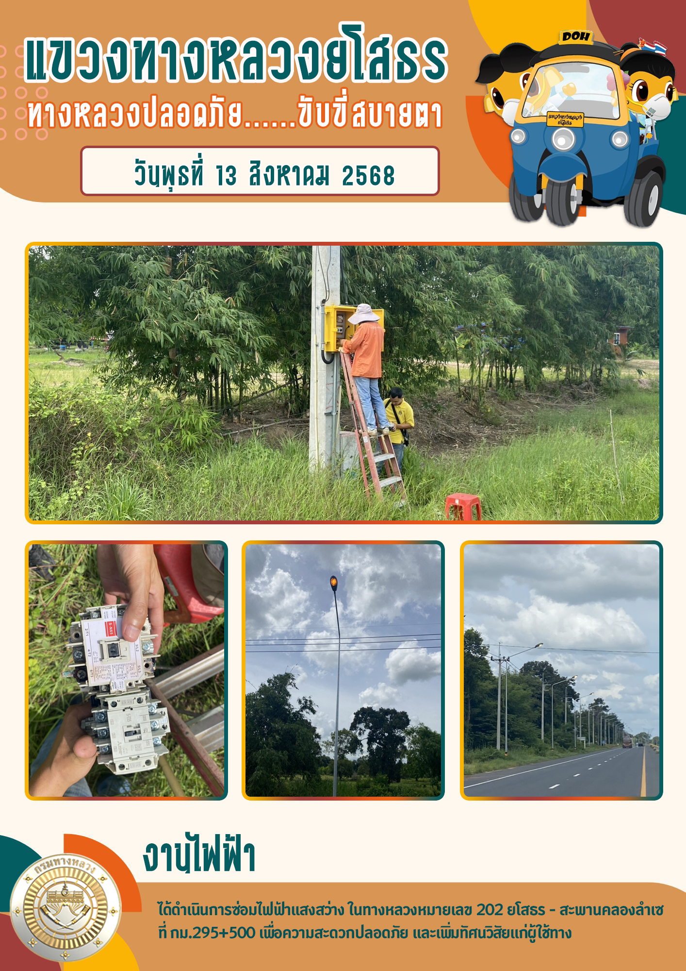 วันพุธที่ 13 สิงหาคม 2568 งานไฟฟ้า ได้ดำเนินการซ่อมไฟฟ้าแสงสว่าง ในทางหลวงหมายเลข 202 ยโสรร - สะพานคลองลำเซ ที่ กม.295+500 เพื่อความสะดวกปลอดภัย และเพิ่มทัศนวิสัยแก่ผู้ใช้ทาง