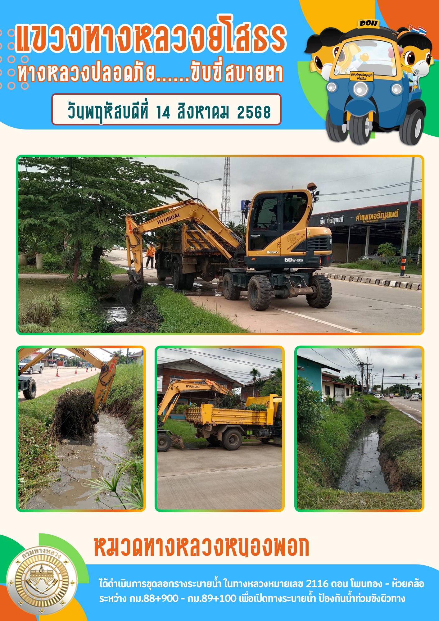 วันพฤหัสบดีที่ 14 สิงหาคม 2568 หมวดทางหลวงหนองพอก ได้ดำเนินการขุดลอกรางระบายน้ำ ในทางหลวงหมายเลข 2116 ตอน โพนทอง - ห้วยคล้อ ระหว่าง กม.88+900 - กม.89+100 เพื่อเปิดทางระบายน้ำ ป้องกันน้ำท่วมขังผิวทาง