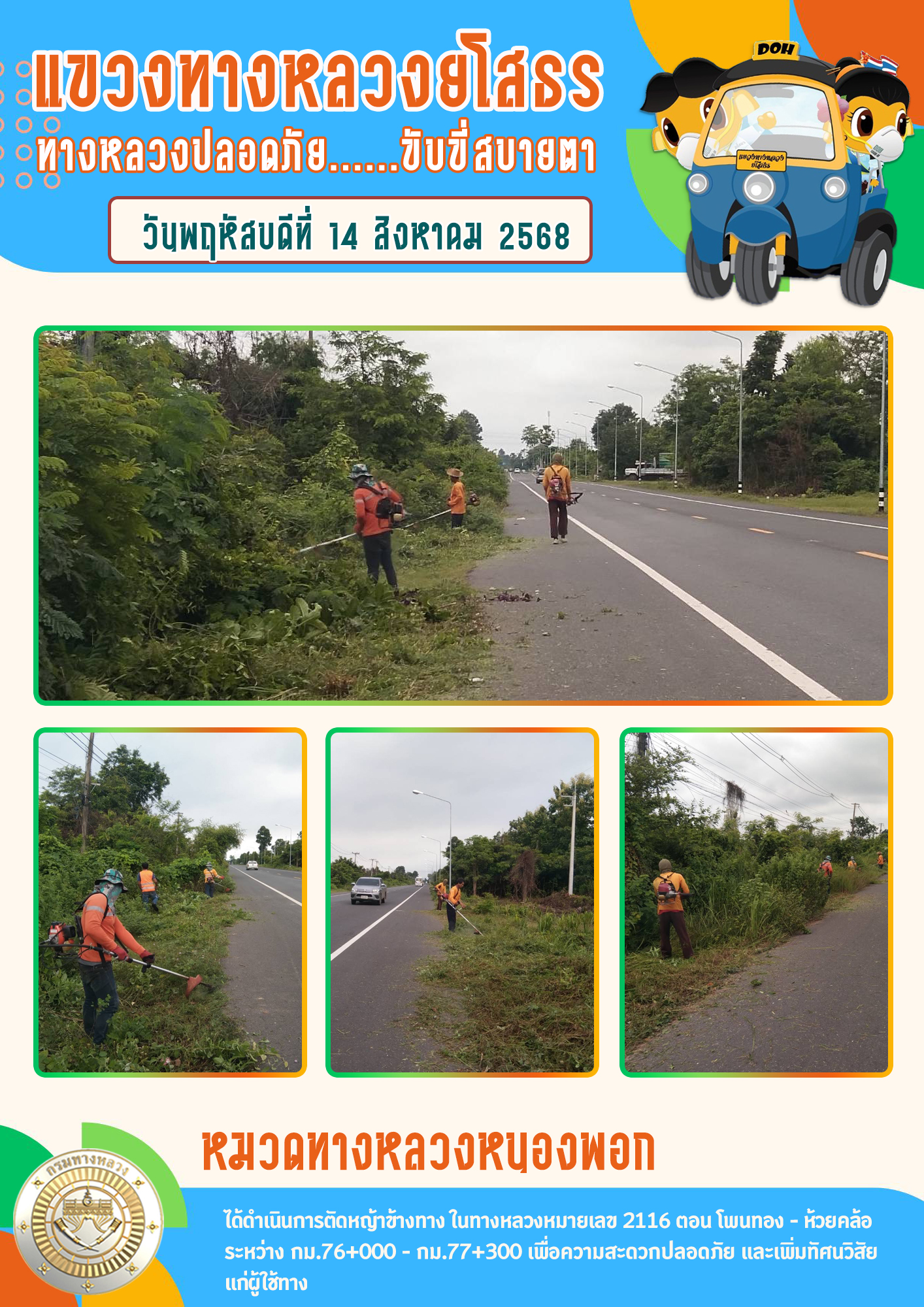 วันพฤหัสบดีที่ 14 สิงหาคม 2568 หมวดทางหลวงหนองพอก ได้ดำเนินการตัดหญ้าข้างทาง ในทางหลวงหมายเลข 2116 ตอน โพนทอง - ห้วยคล้อ ระหว่าง กม.76+000 - กม.77+300 เพื่อความสะดวกปลอดภัย และเพิ่มทัศนวิสัย แก่ผู้ใช้ทาง