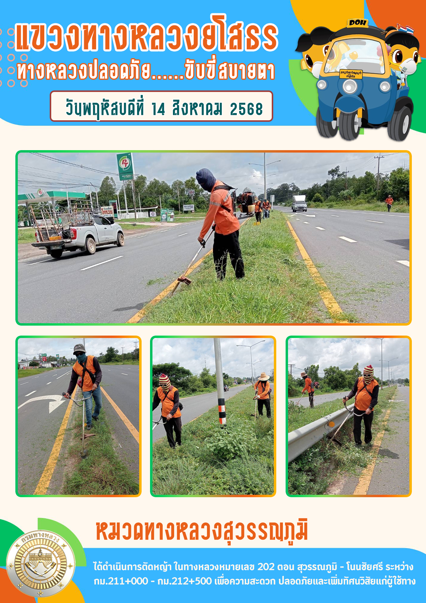 วันพฤหัสบดีที่ 14 สิงหาคม 2568 หมวดทางหลวงสุวรรณภูมิ ได้ดำเนินการตัดหญ้า ในทางหลวงหมายเลข 202 ตอน สุวรรณภูมิ - โนนชัยศรี ระหว่าง กม.211+000 - กม.212+500 เพื่อความสะดวก ปลอดภัยและเพิ่มทัศนวิสัยแก่ผู้ใช้ทาง