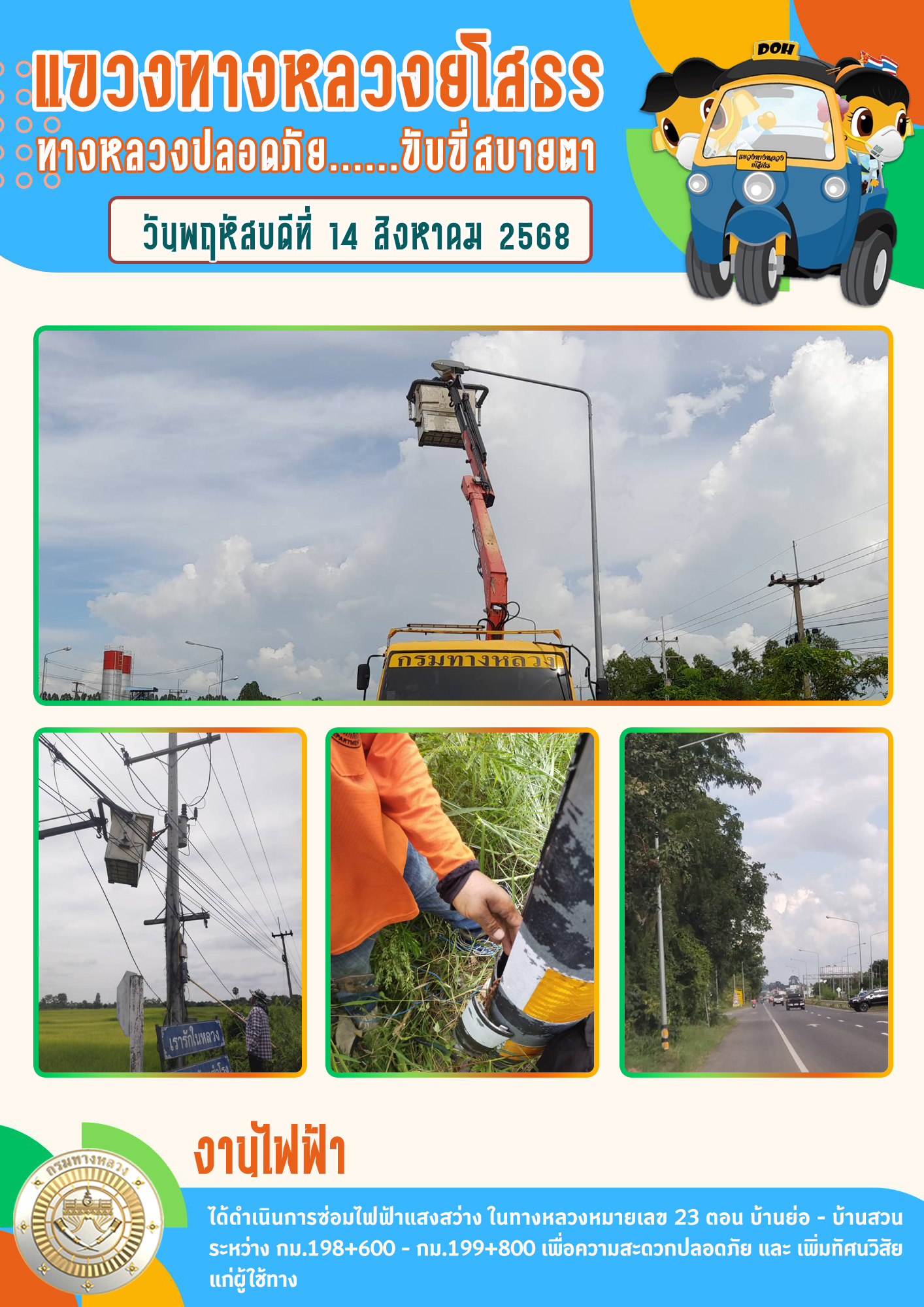 วันพฤหัสบดีที่ 14 สิงหาคม 2568 งานไฟฟ้า ได้ดำเนินการซ่อมไฟฟ้าแสงสว่าง ในทางหลวงหมายเลข 23 ตอน บ้านย่อ - บ้านสวน ระหว่าง กม.198+600 - กม.199+800 เพื่อความสะดวกปลอดภัย และเพิ่มทัศนวิสัย แก่ผู้ใช้ทาง