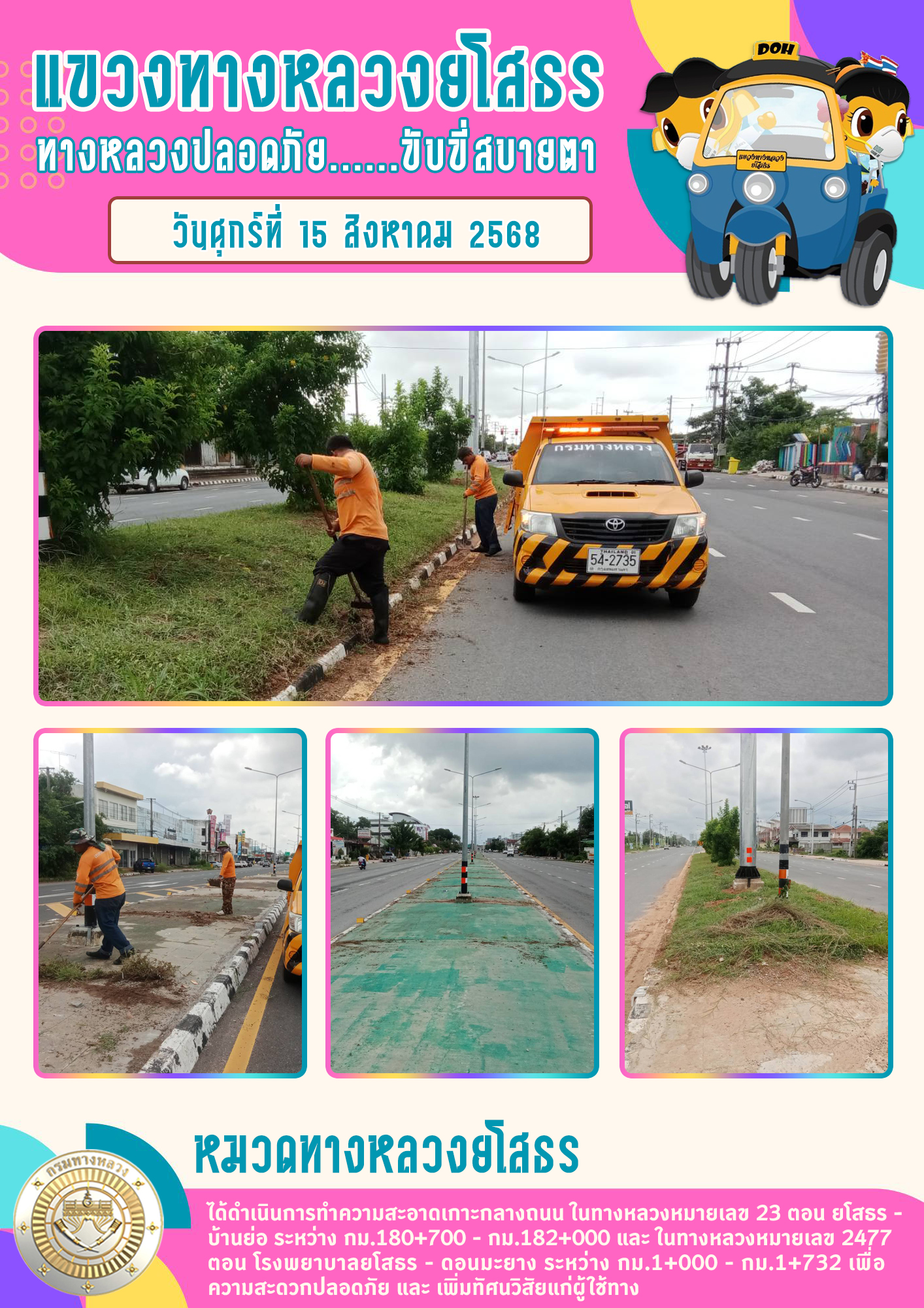 วันศุกร์ที่ 15 สิงหาคม 2568 หมวดทางหลวงยโสธร ได้ดำเนินการทำความสะอาดเกาะกลางถนน ในทางหลวงหมายเลข 23 ตอน ยโสธร - บ้านย่อ ระหว่าง กม.180+700 - กม.182+000 และในทางหลวงหมายเลข 2477 ตอน โรงพยาบาลยโสธร - ดอนมะยาง ระหว่าง กม.1+000 - กม.1+732 เพื่อความสะดวกป