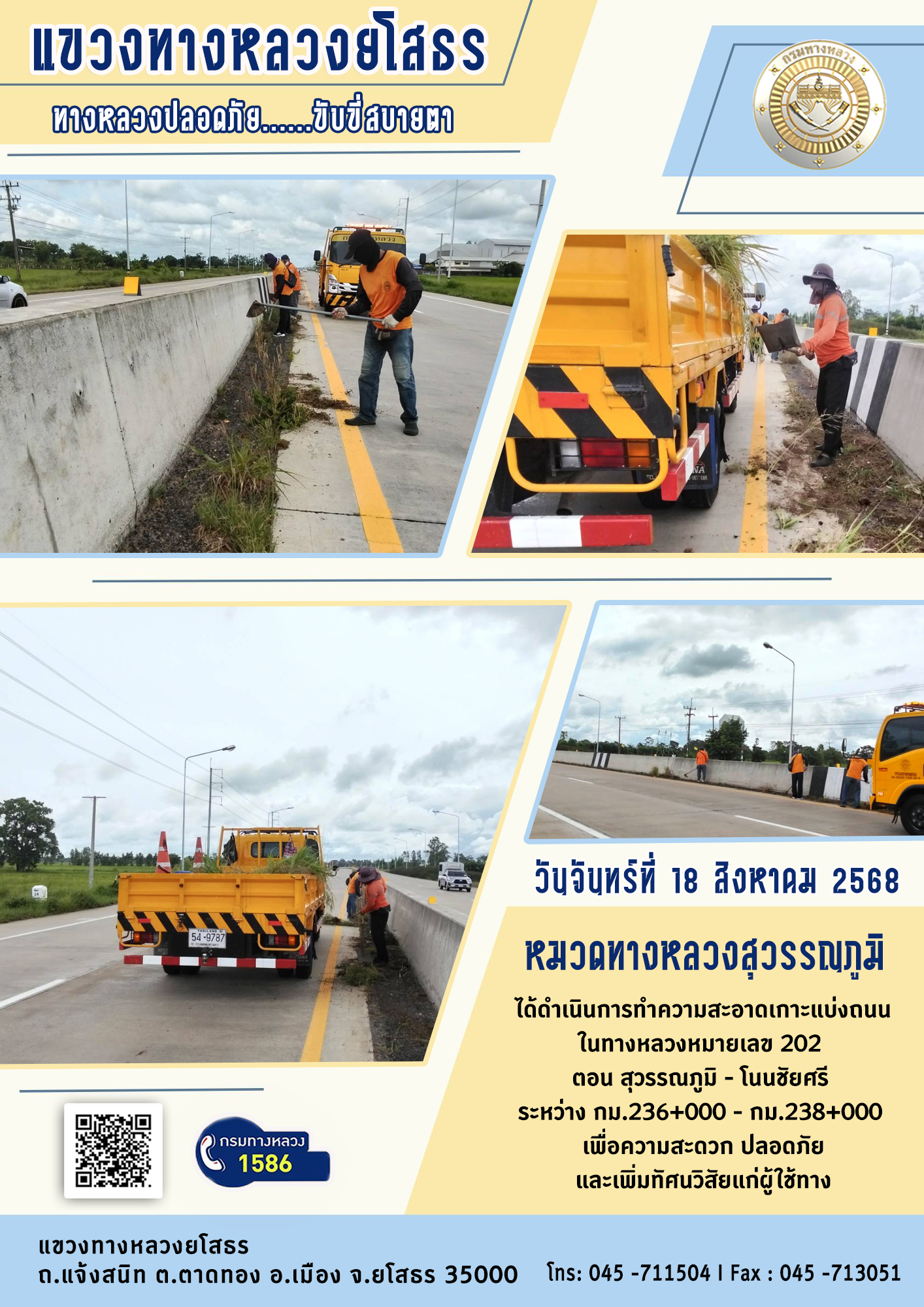 วันจันทร์ที่ 18 สิงหาคม 2568 หมวดทางหลวงสุวรรณภูมิ ได้ดำเนินการทำความสะอาดเกาะแบ่งถนน ในทางหลวงหมายเลข 202 ตอน สุวรรณภูมิ - โนนชัยศรี ระหว่าง กม.236+000 - กม.238+000 เพื่อความสะดวก ปลอดภัย และเพิ่มทัศนวิสัยแก่ผู้ใช้ทาง
