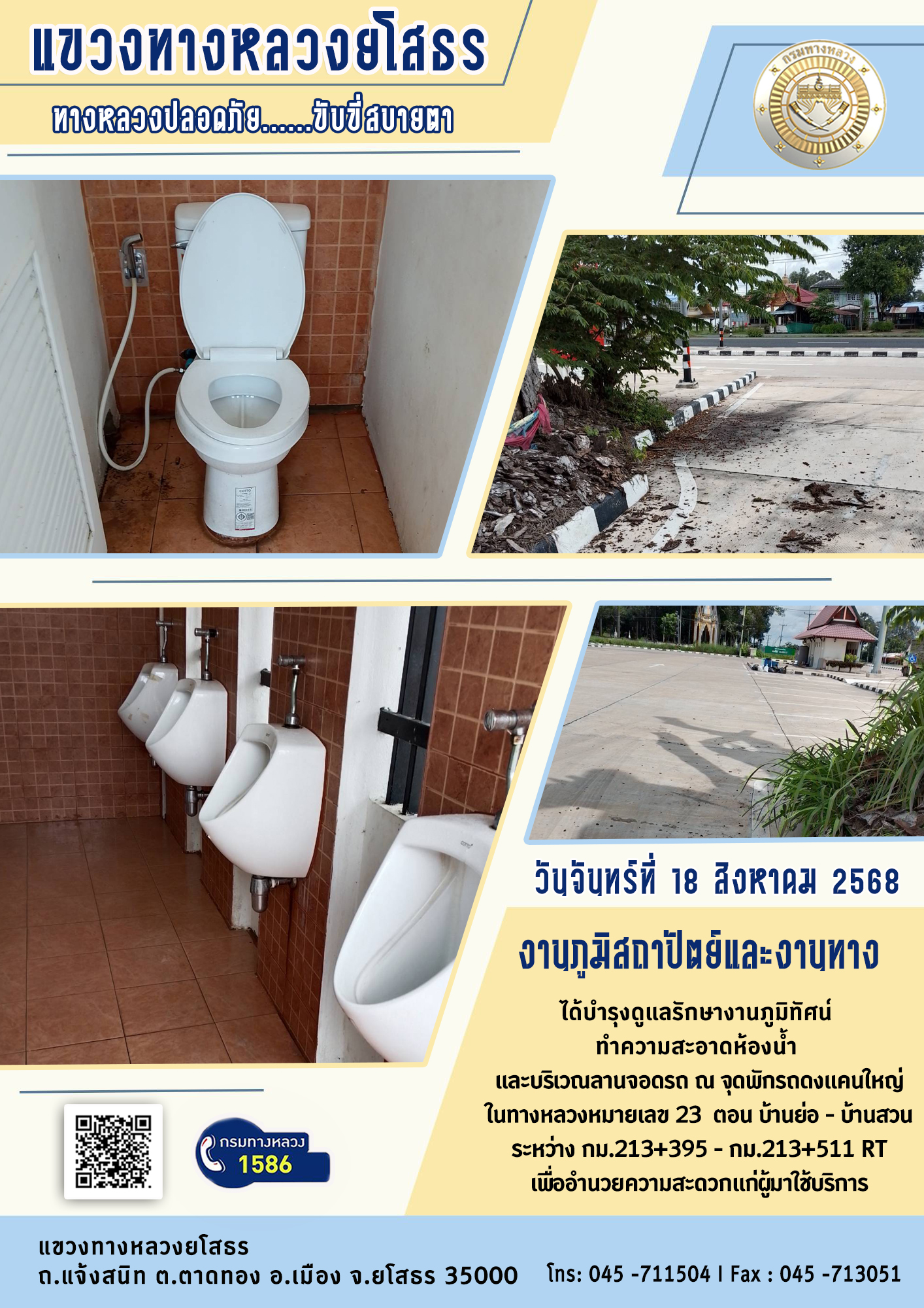 - [10:21] ทั่วไป วันอังคารที่ 31 มีนาคม 2569 งานอำนวยความปลอดภัย ได้ดำเนินการตัดหญ้า ทำความสะอาดภายในบริเวณแขวงทางหลวงยโสธร
