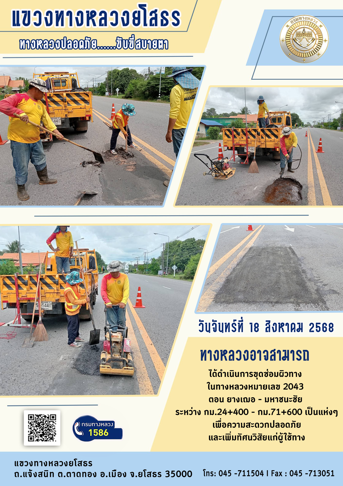 วันจันทร์ที่ 18 สิงหาคม 2568 ทางหลวงอาจสามารถ ได้ดำเนินการขุดซ่อมผิวทาง ในทางหลวงหมายเลข 2043 ตอน ยางเฌอ - มหาชนะชัย ระหว่าง กม.24+400 - กม.71+600 เป็นแห่งๆ เพื่อความสะดวกปลอดภัย และเพิ่มทัศนวิสัยแก่ผู้ใช้ทาง