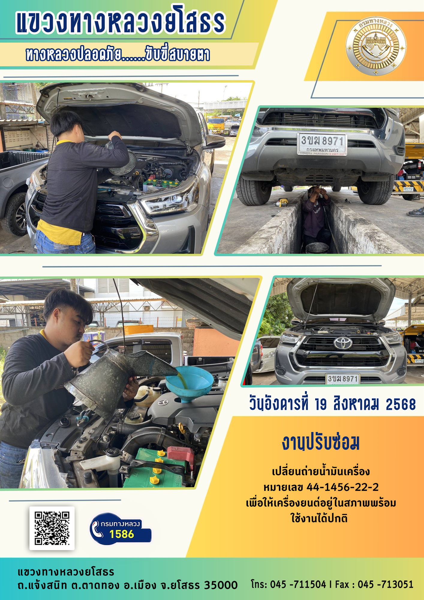 วันอังคารที่ 19 สิงหาคม 2568 งานปรับซ่อม เปลี่ยนถ่ายน้ำมันเครื่อง หมายเลข 44-1456-22-2 เพื่อให้เครื่องยนต์อยู่ในสภาพพร้อม ใช้งานได้ปกติ