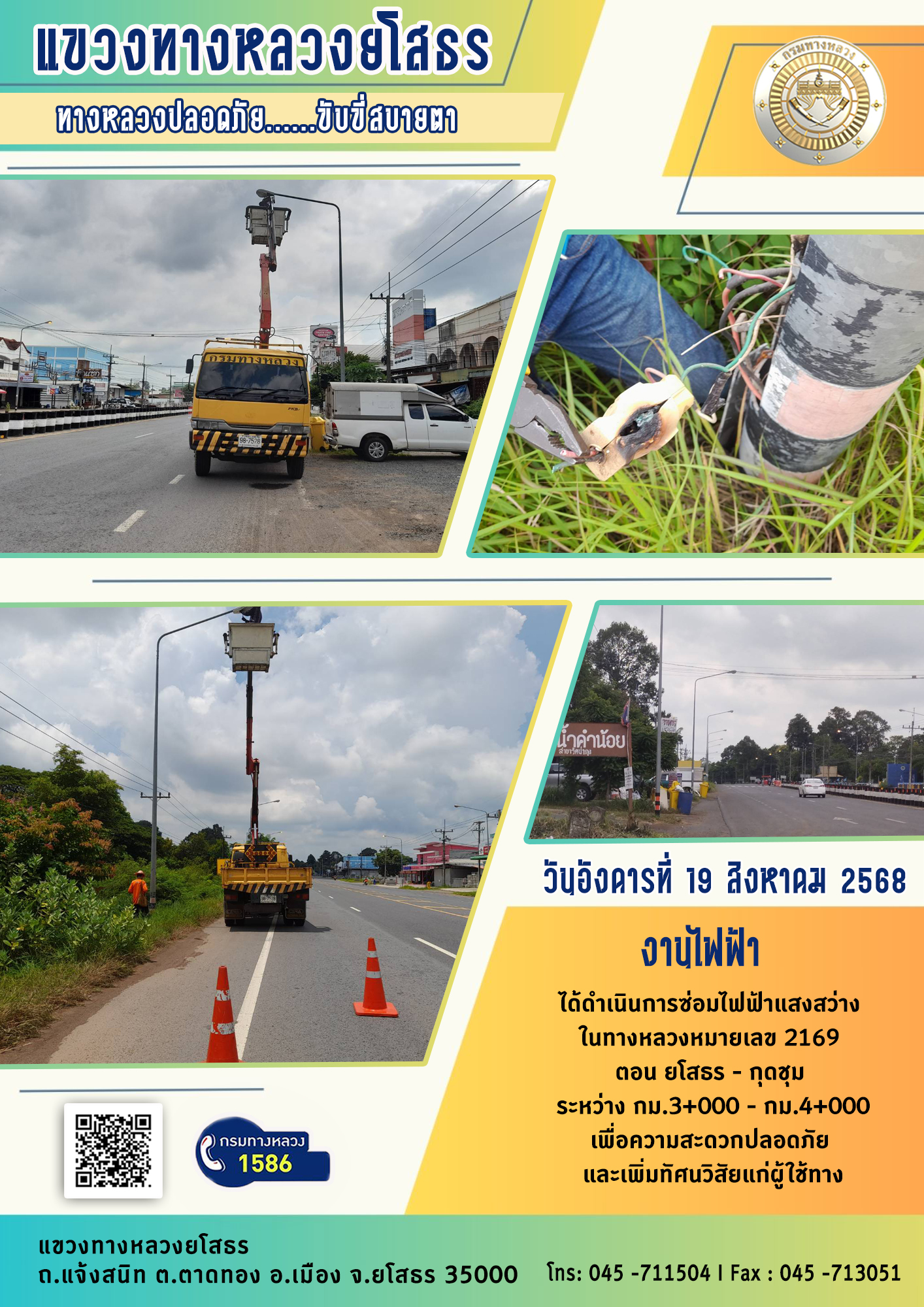 วันอังคารที่ 19 สิงหาคม 2568 งานไฟฟ้า ได้ดำเนินการซ่อมไฟฟ้าแสงสว่าง ในทางหลวงหมายเลข 2169 ตอน ยโสธร - กุดชุม ระหว่าง กม.3+000 - กม.4+000 เพื่อความสะดวกปลอดภัย และเพิ่มทัศนวิสัยแก่ผู้ใช้ทาง