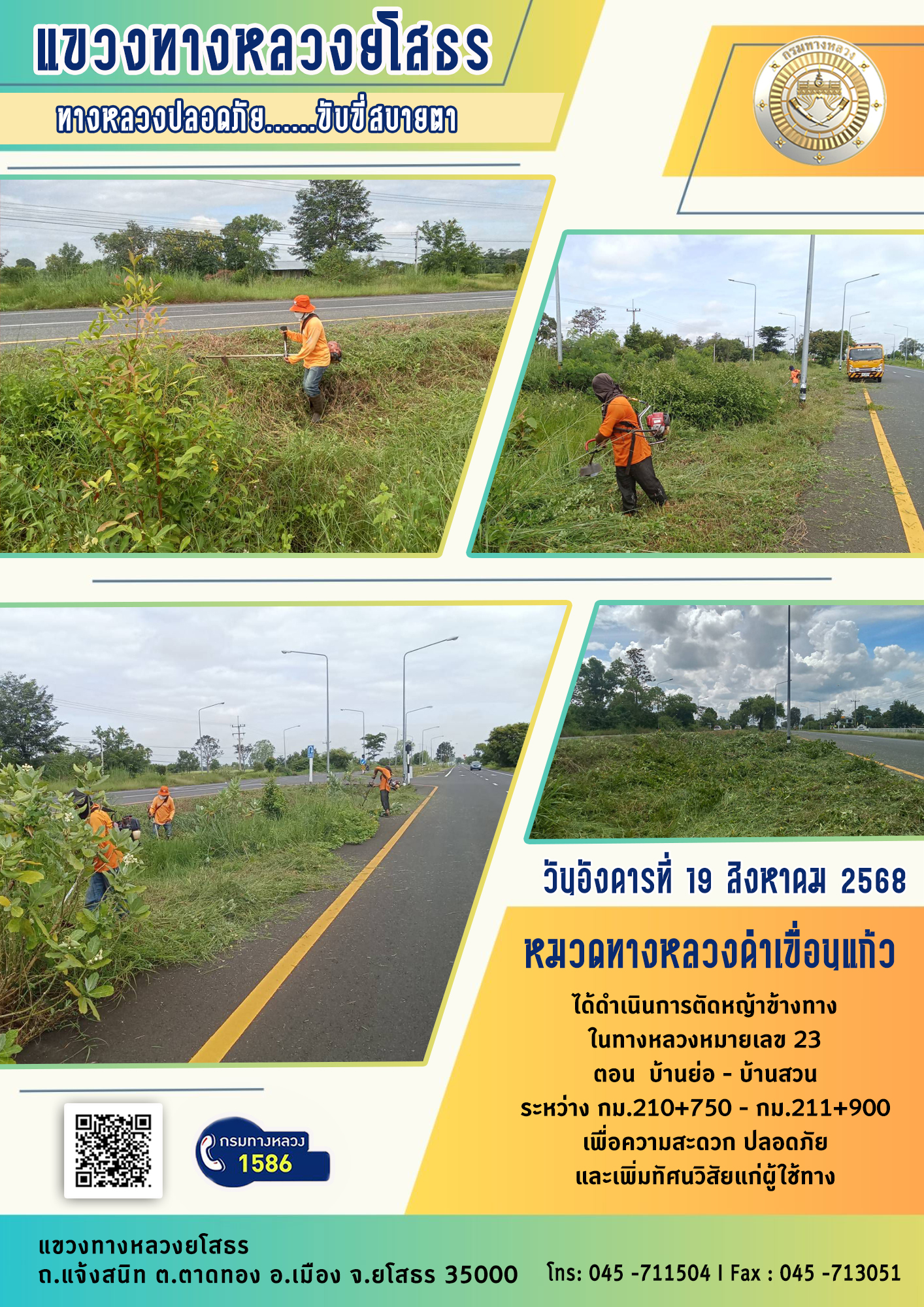 วันอังคารที่ 19 สิงหาคม 2568 หมวดทางหลวงคำเขื่อนแก้ว ได้ดำเนินการตัดหญ้าข้างทาง ในทางหลวงหมายเลข 23 ตอน บ้านย่อ - บ้านสวน ระหว่าง กม.210+750 - กม.211+900 เพื่อความสะดวก ปลอดภัย และเพิ่มทัศนวิสัยแก่ผู้ใช้ทาง