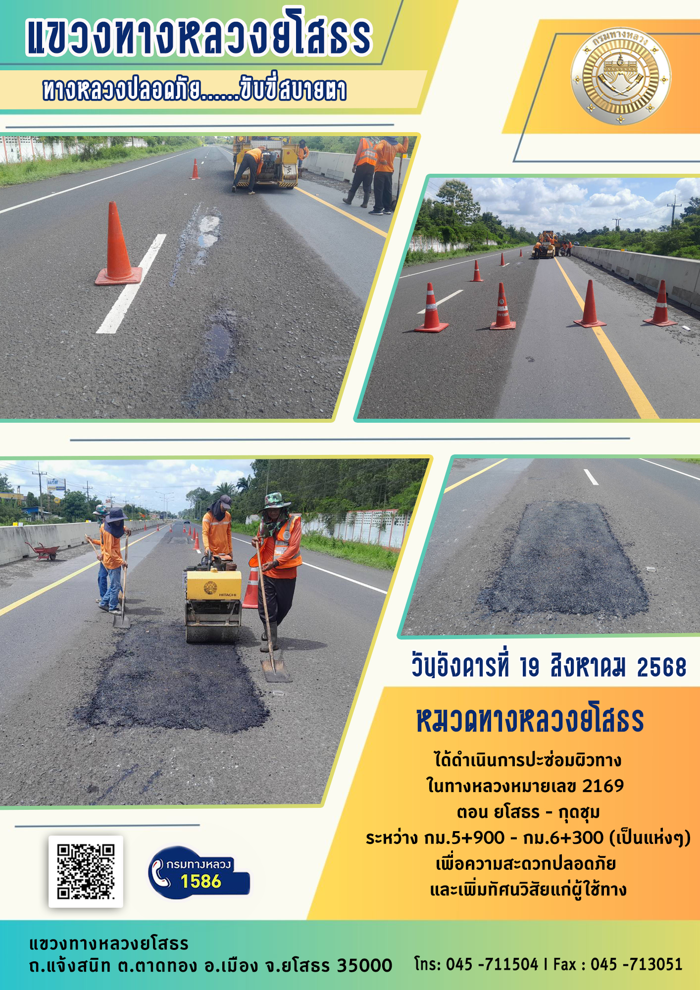 วันอังคารที่ 19 สิงหาคม 2568 หมวดทางหลวงยโสธร ได้ดำเนินการปะซ่อมผิวทาง ในทางหลวงหมายเลข 2169 ตอน ยโสธร - กุดชุม ระหว่าง กม.5+900 - กม.6+300 (เป็นแห่งๆ) เพื่อความสะดวกปลอดภัย และเพิ่มทัศนวิสัยแก่ผู้ใช้ทาง